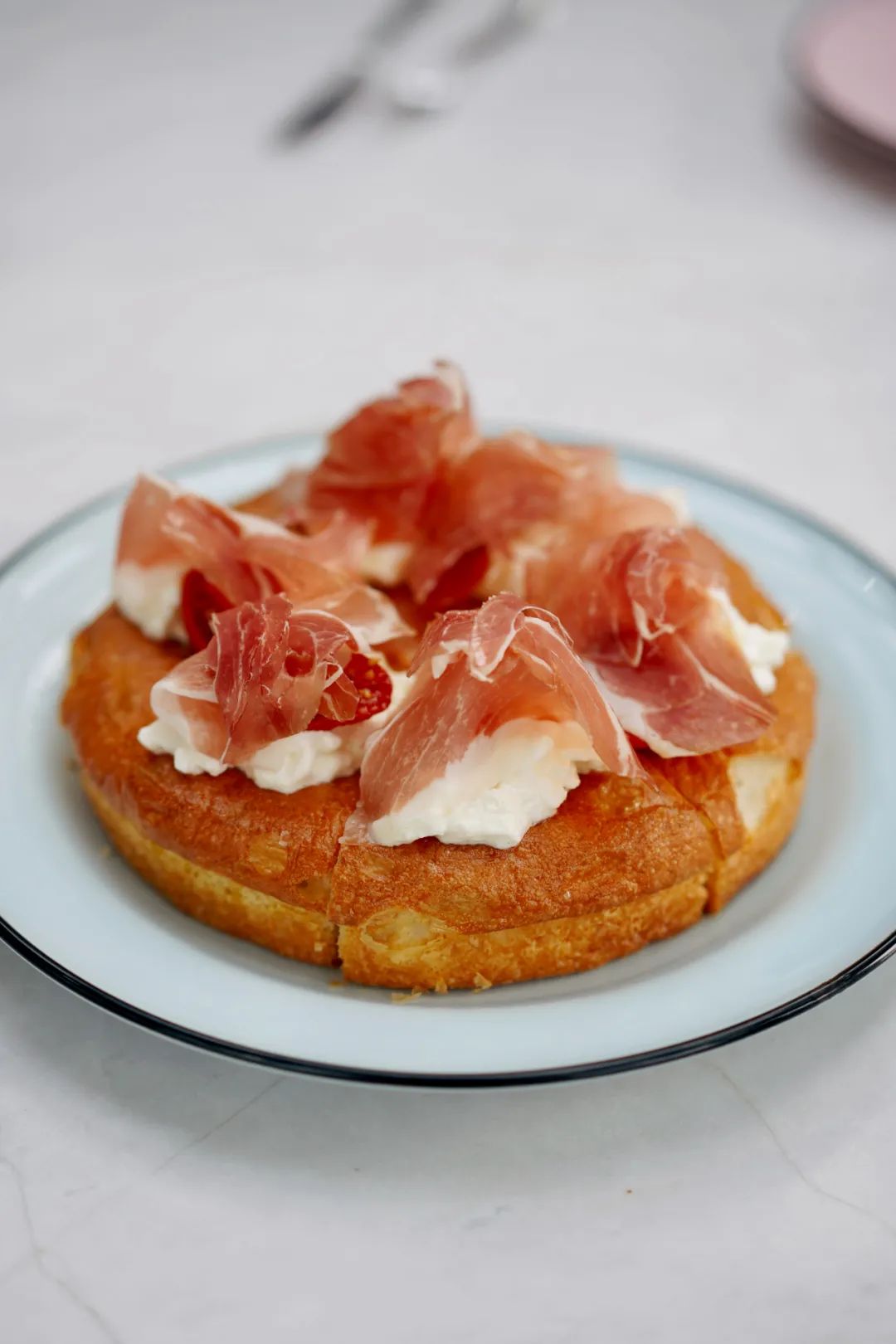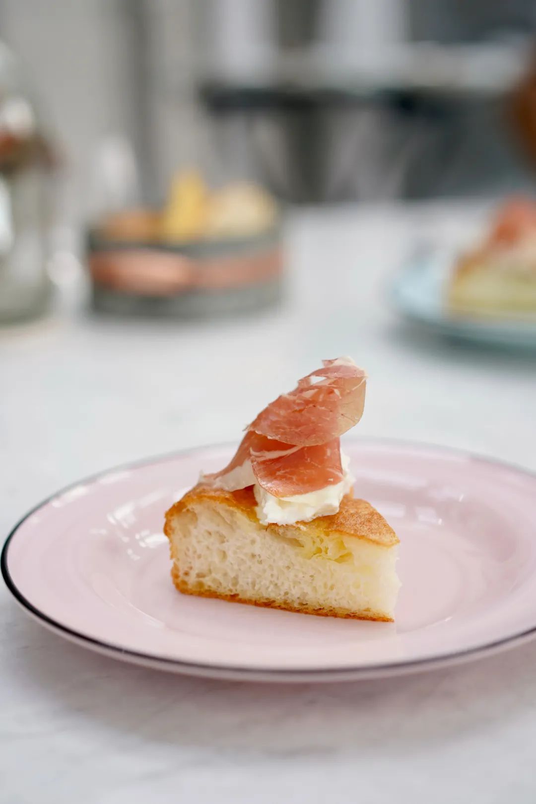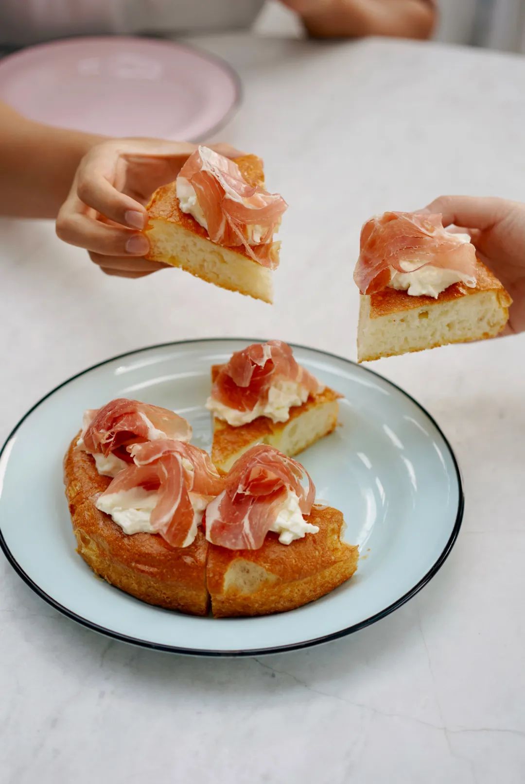 这个饼底先蒸再烤,表皮微酥,里面松软,加上溏心的布拉塔芝士,还有意大利Culatello火腿,简单的组合,总是最好嗑。