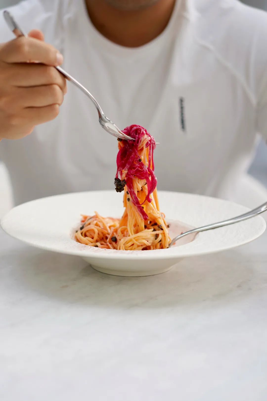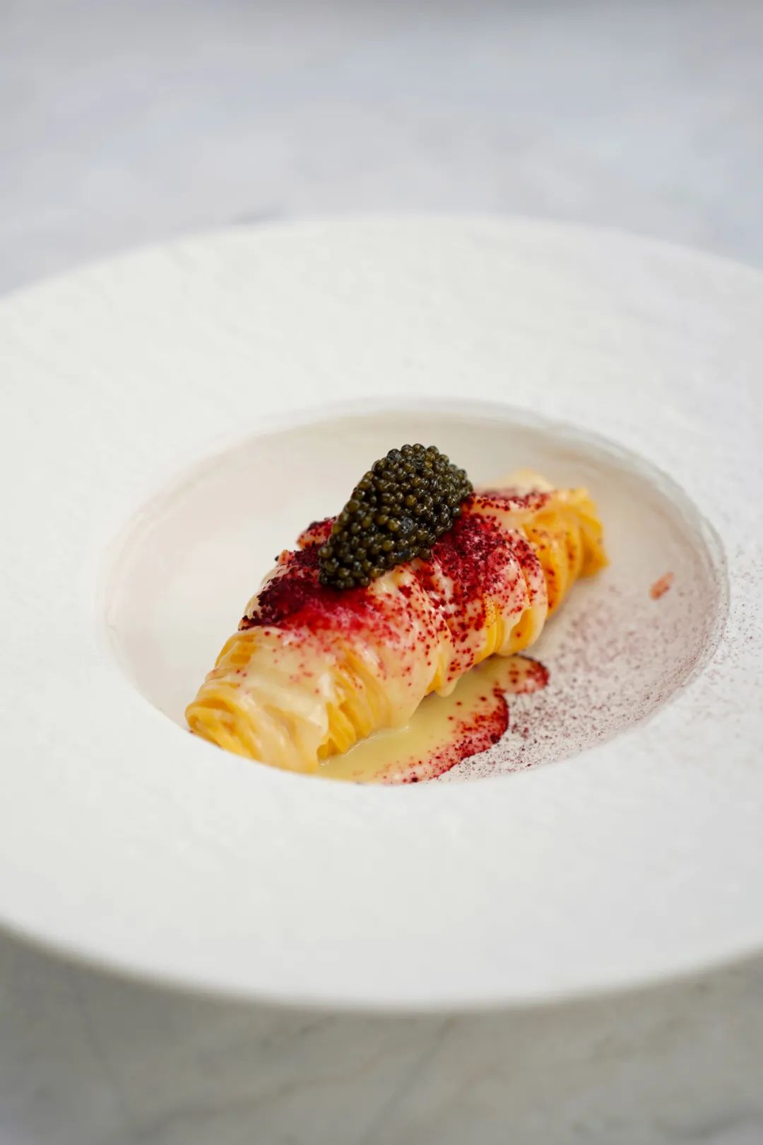 Tagliolini手工细面,加上鱼子酱和马斯卡彭奶油汁做浇头,表面撒了甜菜根粉,往下捞还有小惊喜。