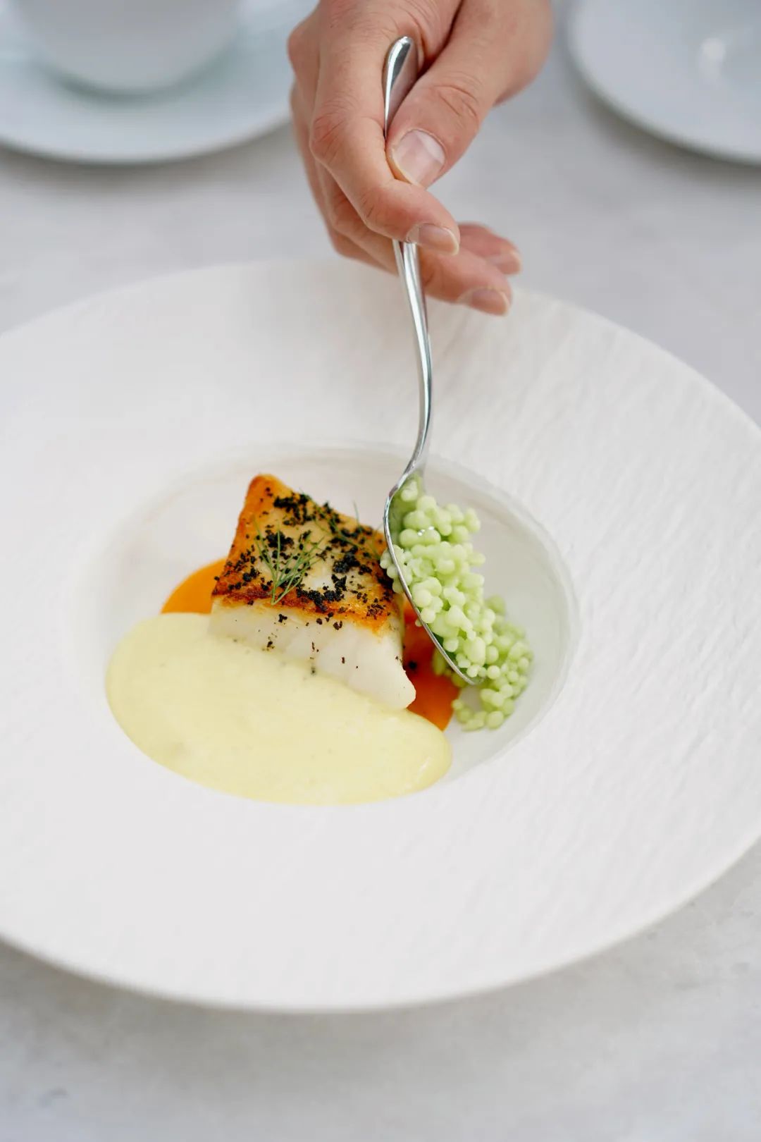 鱼肉火候很好,三种酱汁被做成三种不同质地的形态——