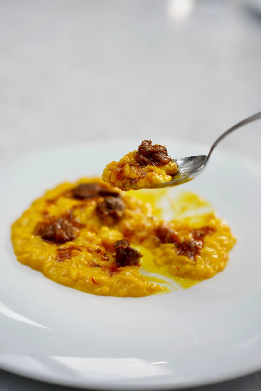 看这个绵滑的奶油质感,加上炖牛小腿肉,以为会非常浓腻,但后调中有一味清新明快的柠檬香,收敛烩饭的油脂感,又让人马上想再续一口。
