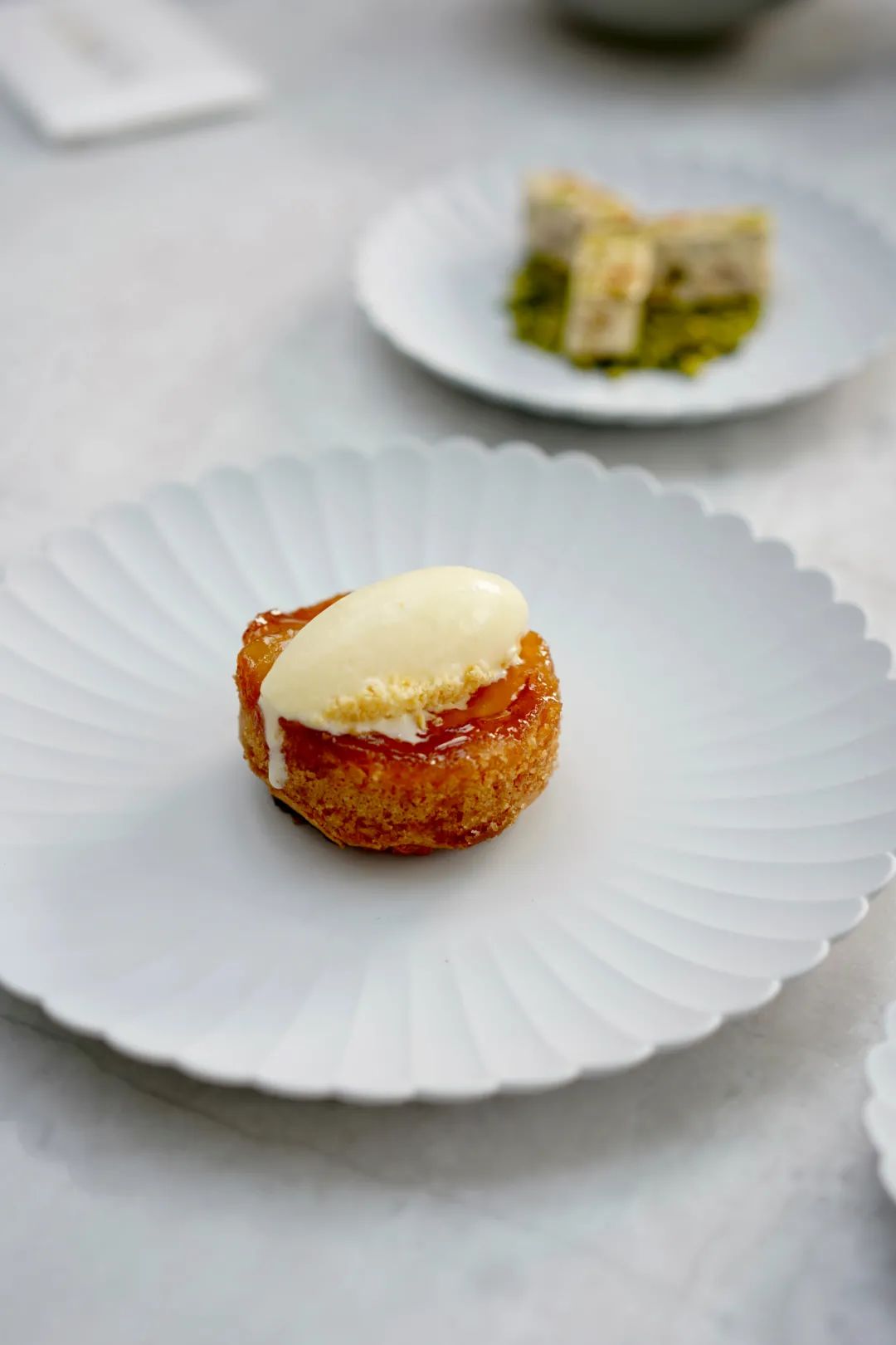 这是我最喜欢的一个——软苹果蛋糕,热度和甜度刚好,最好在这勺柠檬冰淇淋缓慢融化前吃掉。
