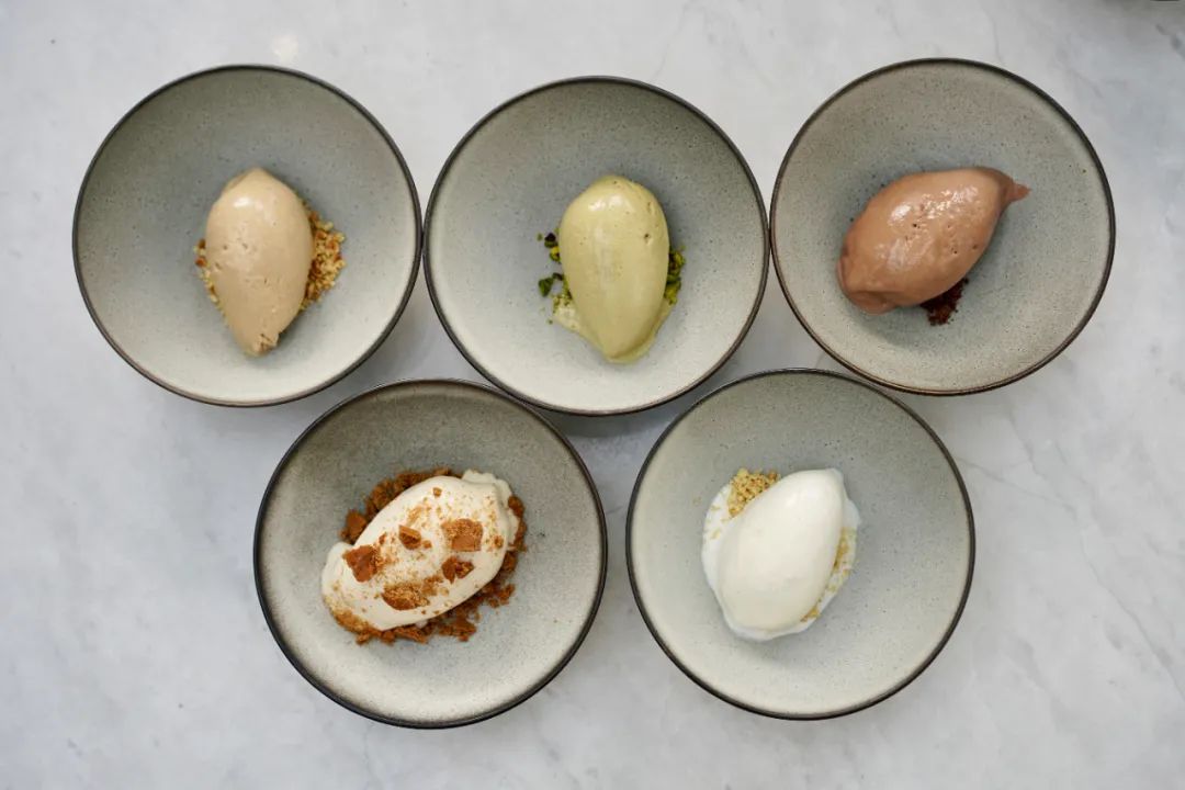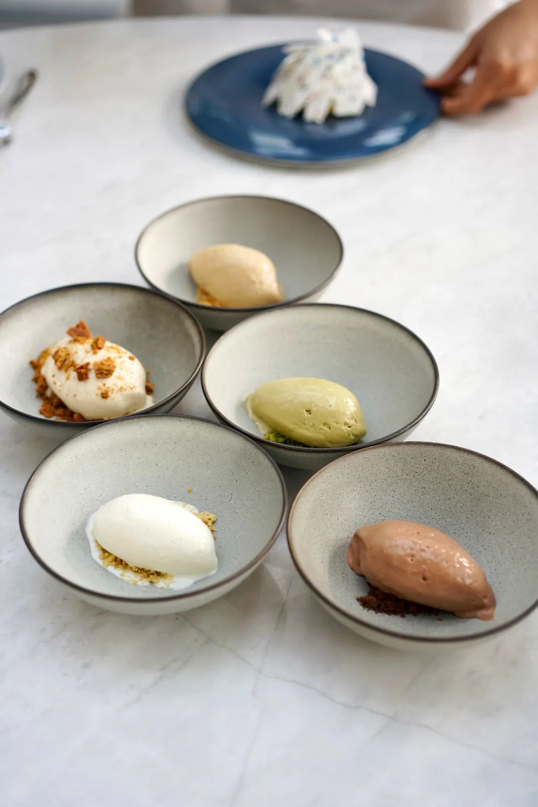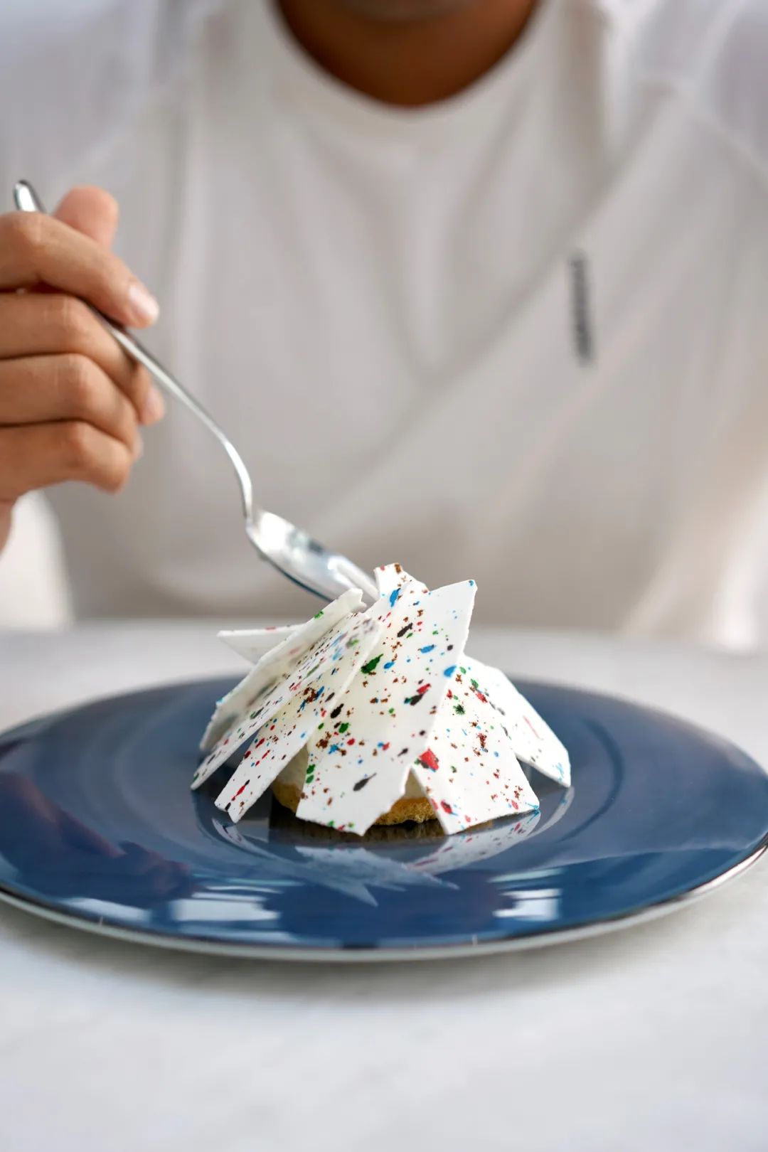 这道甜品也是为尤伦斯创作的吧,蛋白片好像 Damien Hirst 的彩色波点画。