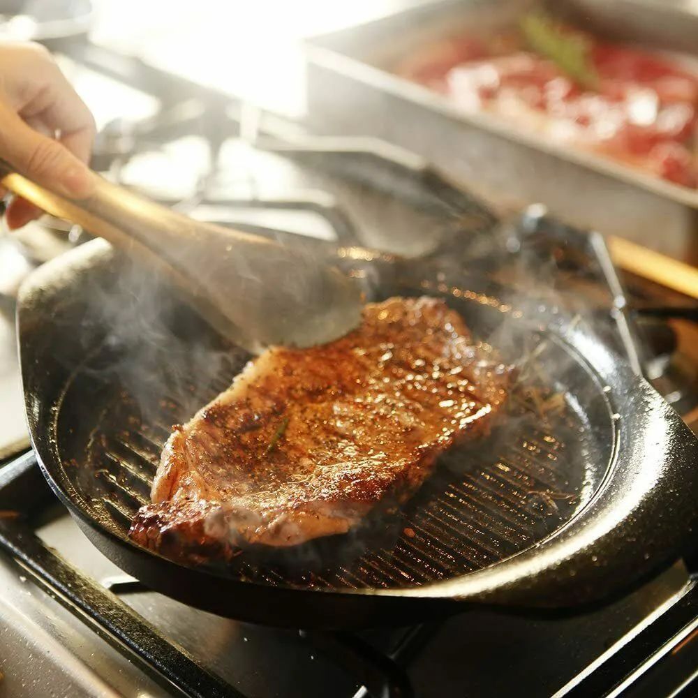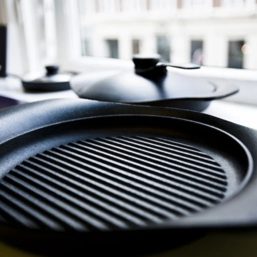 Cast Iron Grill Pan with Lid优雅的流线造型也赋予了原本笨重的铸铁煎锅些许烹饪时的仪式感。