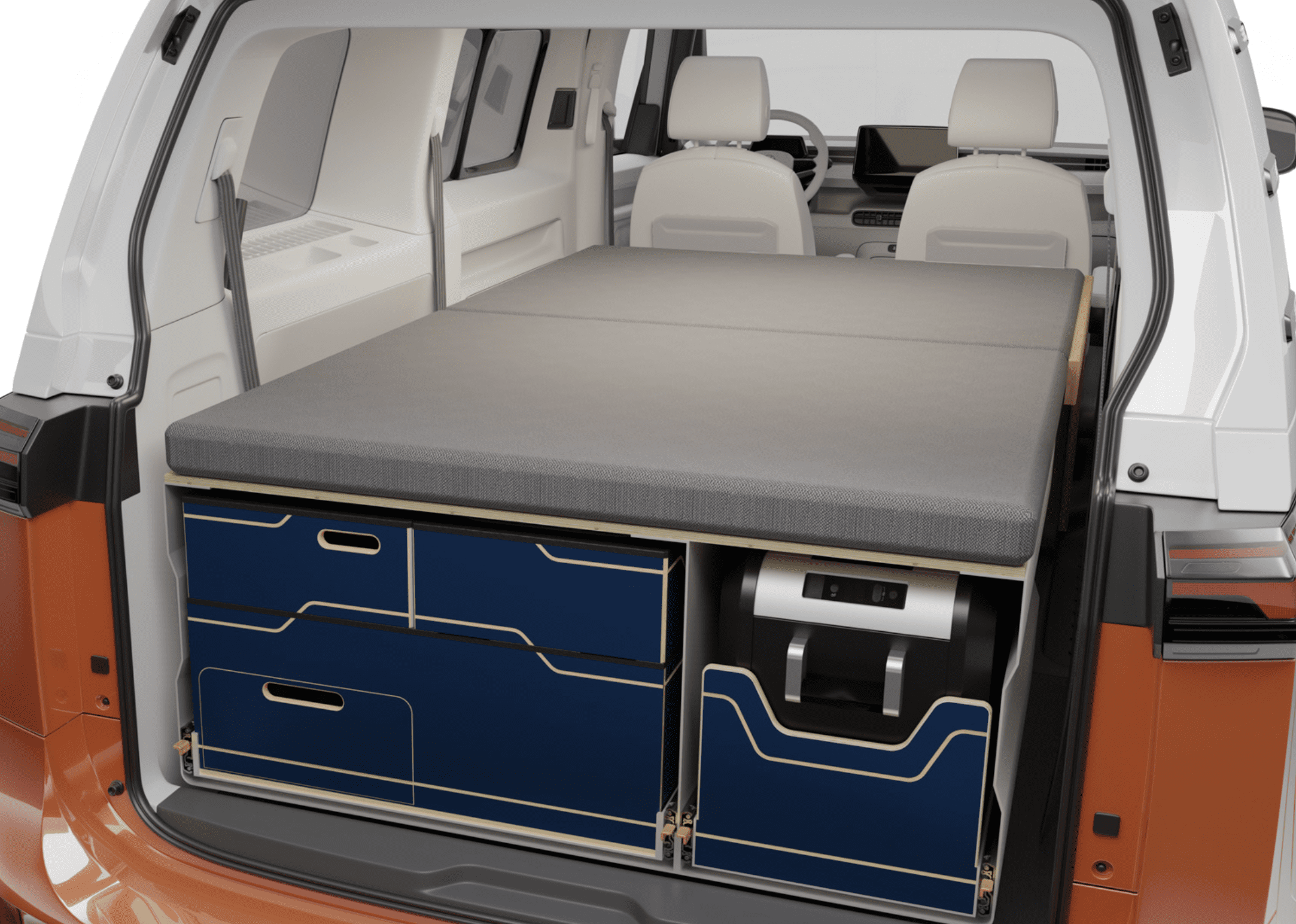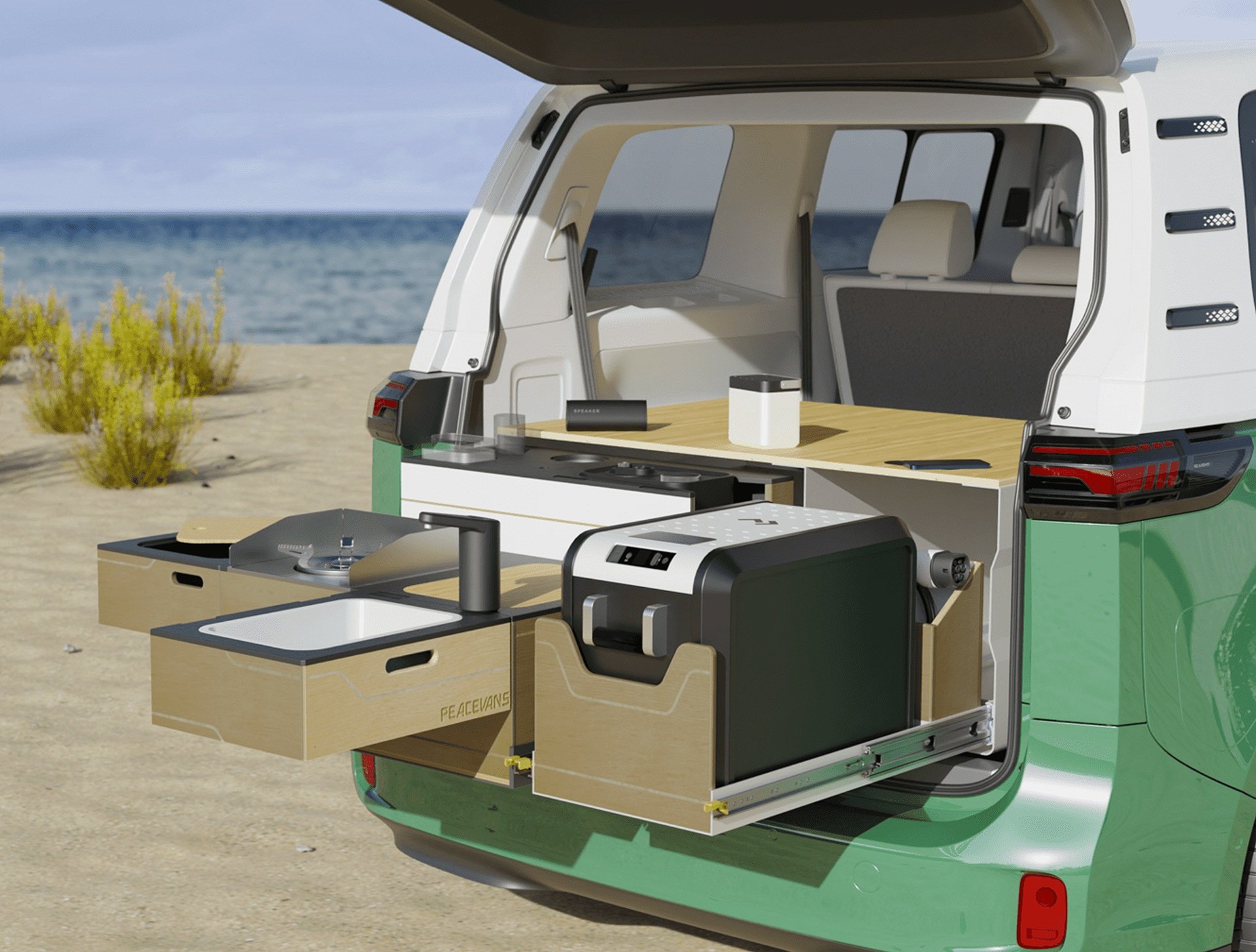 有了 Peace Vans 的改装选项,大众 ID.Buzz 与露营车之间就毫无界限可言。本次 Peace Vans 直接与大众合作,这辆全新 Buzz.Box 将 ID.Buzz 的整个第三排改造成一个可从车辆后部进入的露营厨房。紧凑布局不仅包括烹饪和食物贮藏设施,如 25L Dometic 冰箱、燃气燃烧器、可折叠水槽和大量台面空间,还提供充足存储空间。Buzz.Box 配有照明系统、Sonos 扬声器和无线充电设备,以方便在海滩或露营地使用。