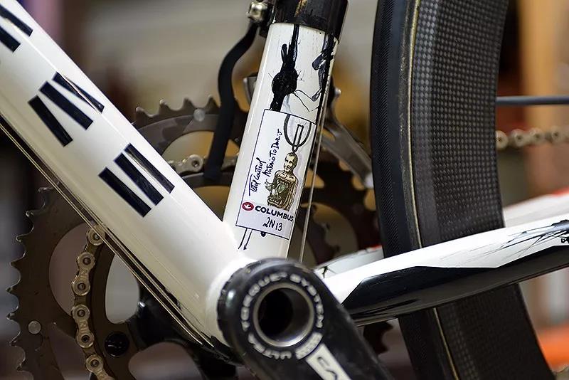 在钢材的选用上,Pegoretti有着自己的独特理念。Columbus是全世界最好的钢架管材供应商,但Pegoretti使用的管材却不同于Columbus市面销售的型号,而是其亲自设定配方、规格,再请Columbus抽制的,这也算是columbus老板Antonio对他的认可与照顾。因此,我们看到Pegoretti车架的管材标上印的都是「Antonio to Dario」。