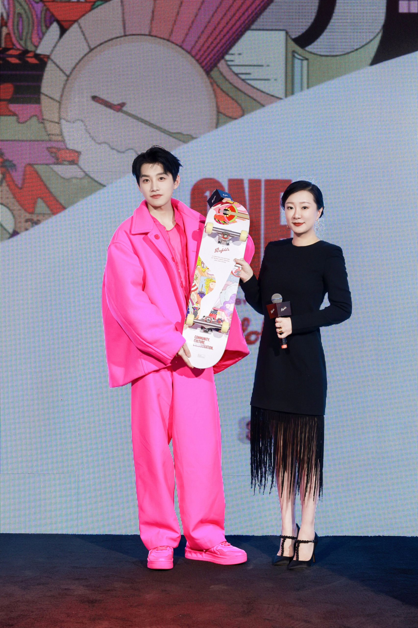 奔富大中华区市场总监姚圆佳女士将充满艺术和潮流文化风格的「奔富一号」滑板赠予范世錡