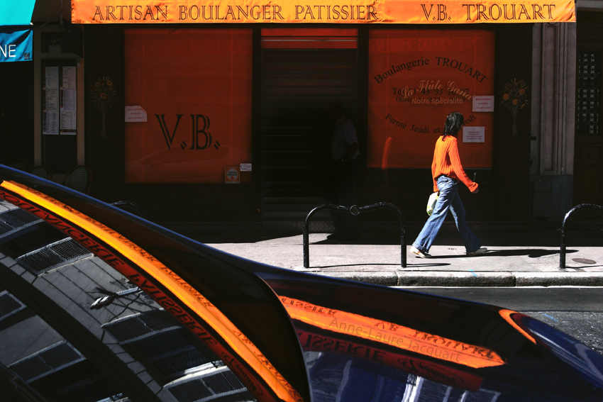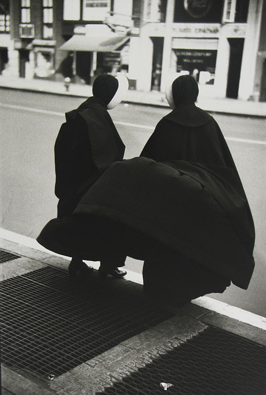 Saul Leiter非常喜欢使用长焦镜头拍摄,因为这样对于街景可以造成微妙的扁平化处理。远处的人或者景物仿佛近在咫尺,而近处的场景也能够很好的融入其中,同时这样拍摄还能让你的作品呈现出拼贴画的视觉创意效果。