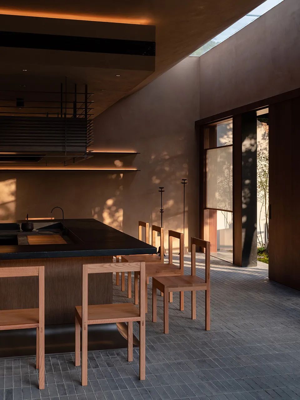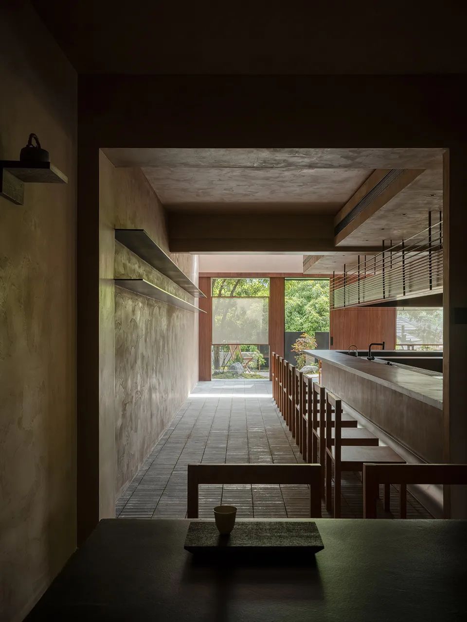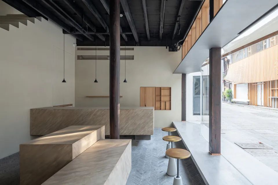 设计师希望突破传统茶室带来的社交距离感 重新梳理整体空间动线 让人们可以在有限的空间结构里自由穿行