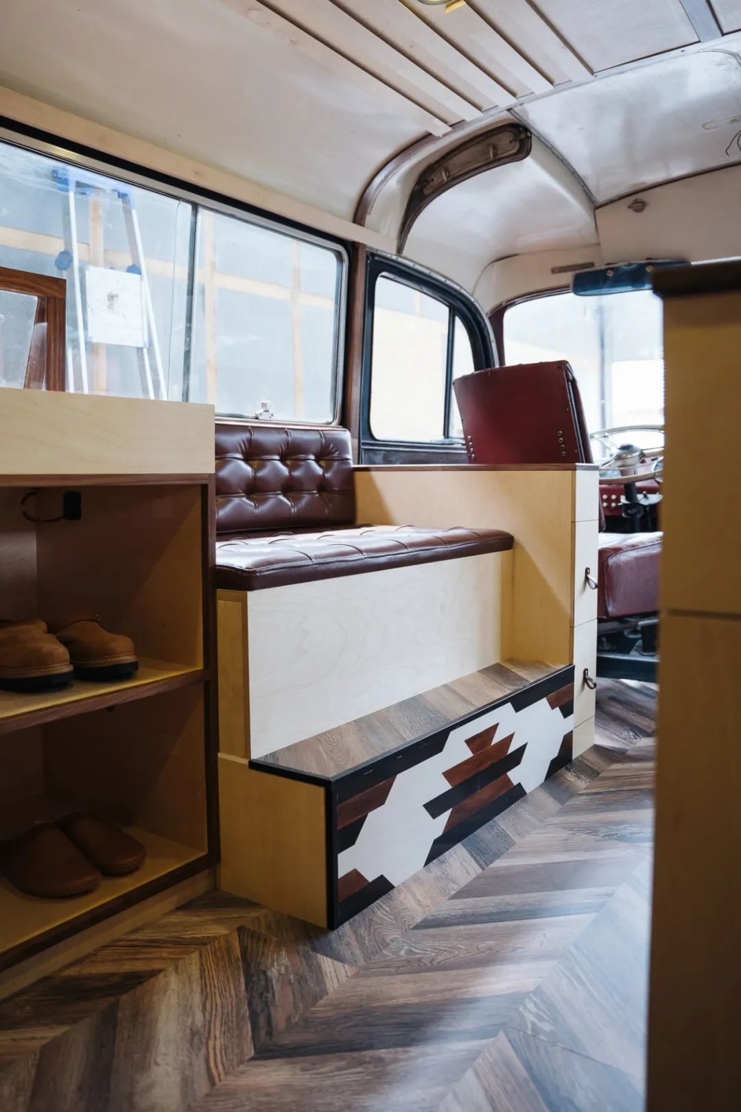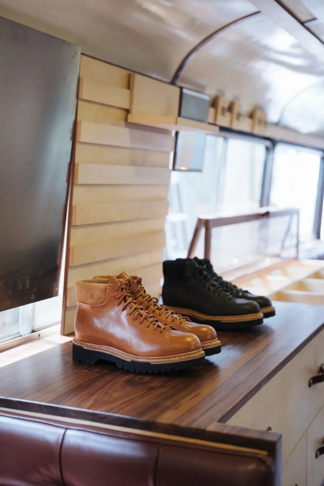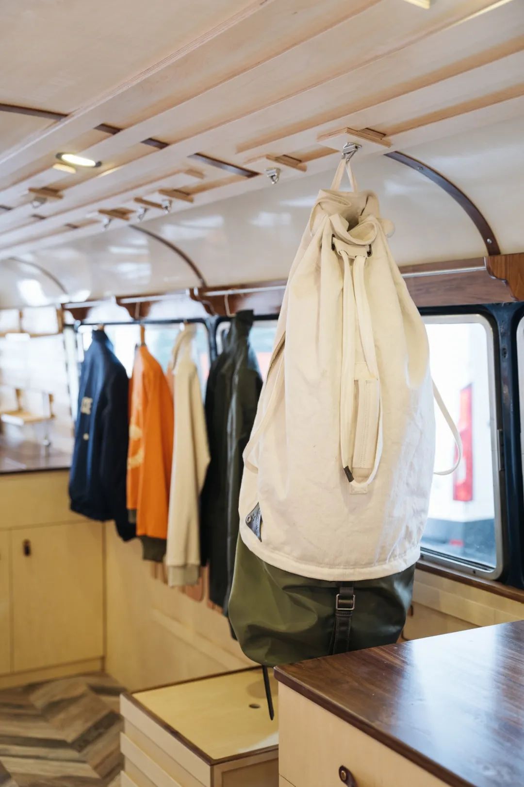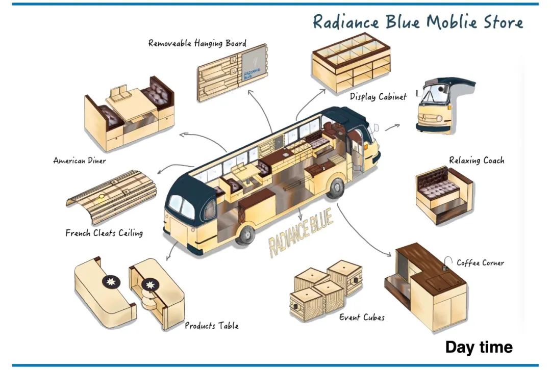 RADIANCE-Blue的Blue Bus里通过后期改造,内部设有店员座位,展品展陈区,更衣室,及可供客人休息的对座沙发。满足使人沉浸于一个移动零售基站的全部需求。