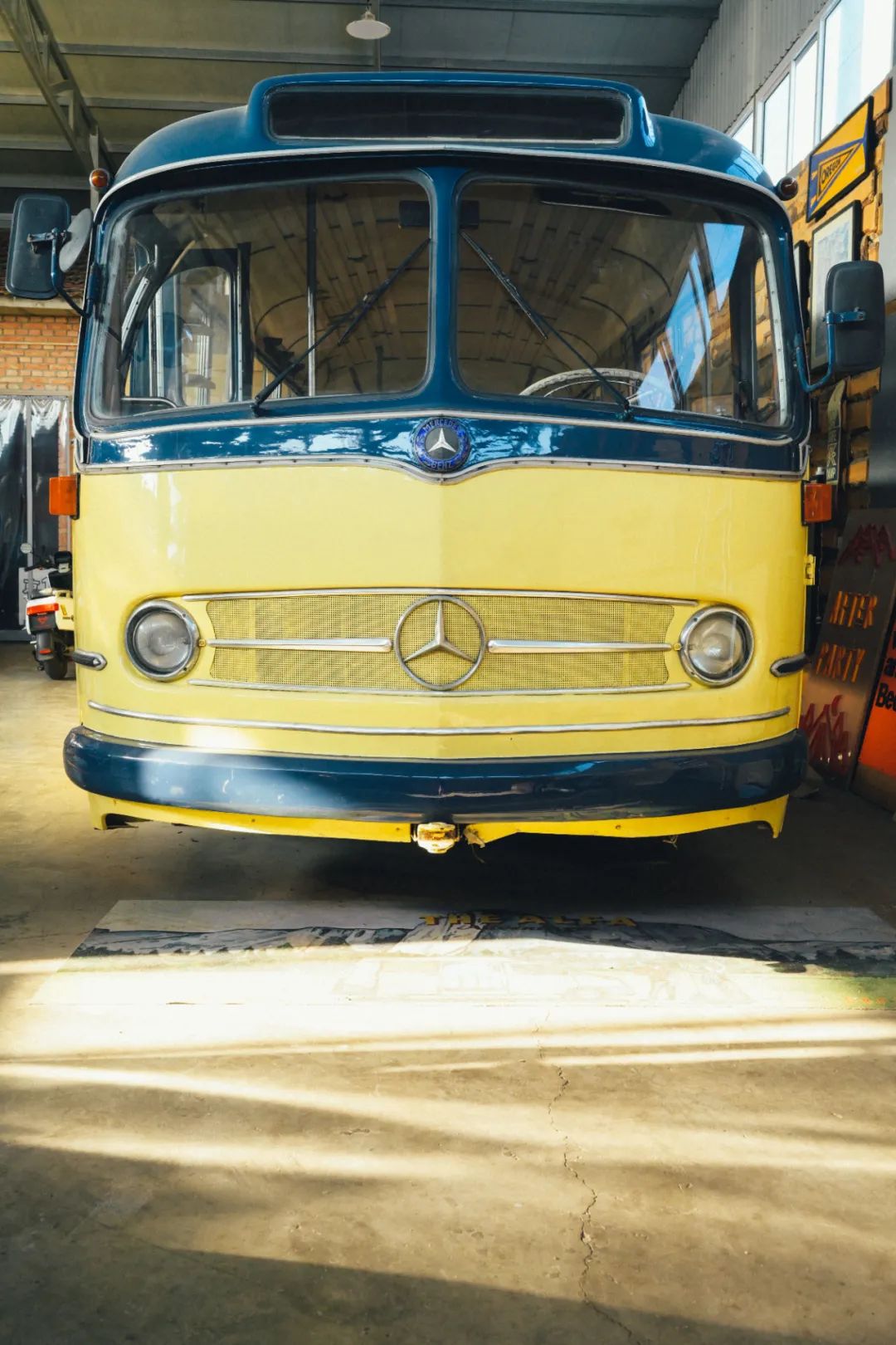 作为复古文化的传播者,RADIANCE-Blue搬出挚爱收藏 – 生产于60年代的梅赛德斯奔驰大巴,并将其装点成Blue Bus Lines的模样。