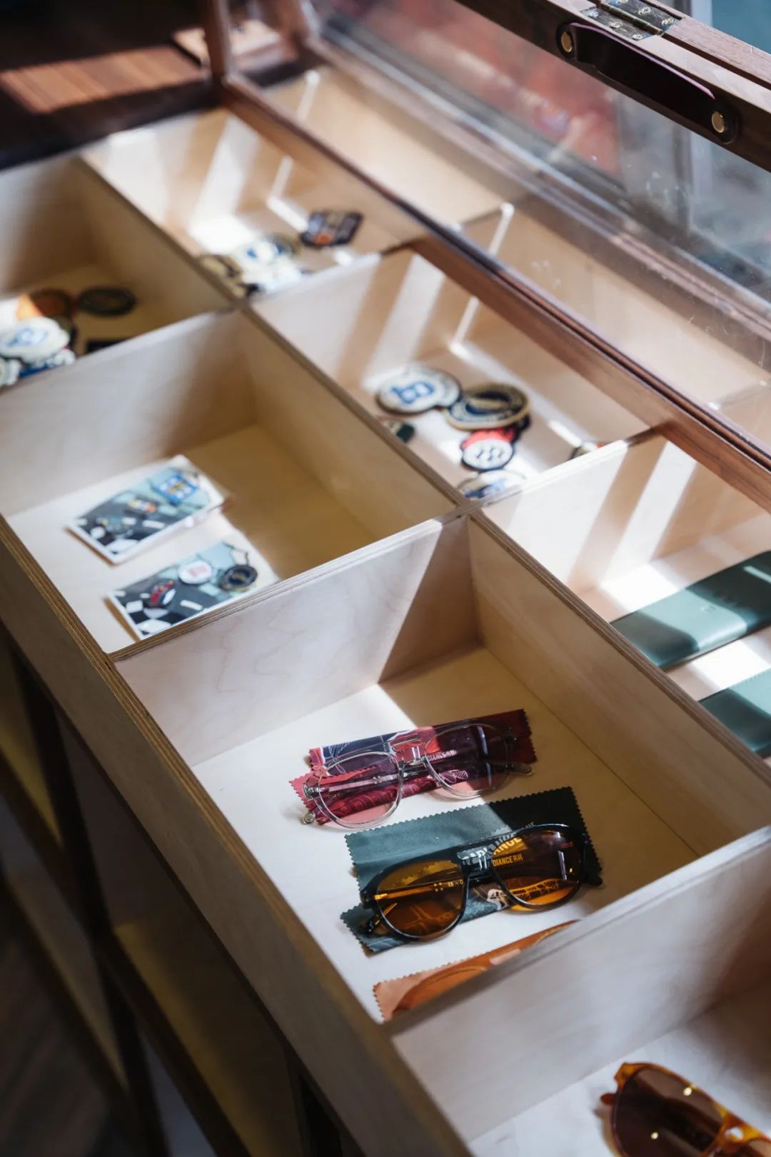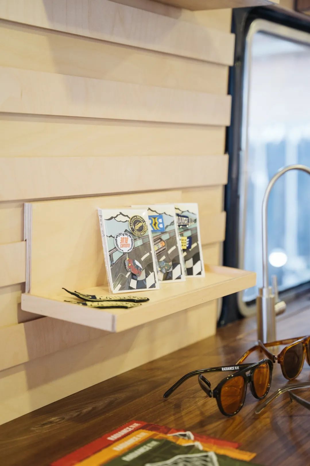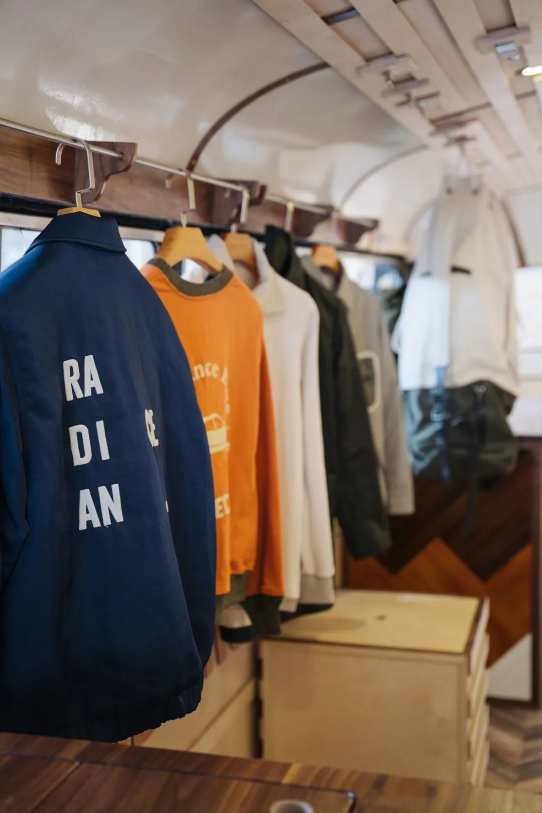 内部展陈包括服装、眼镜等RADIANCE-Blue House Label的21秋冬“Speed Mechanics”赛车主题系列新品及元年复古服饰等。呼应复古巴士巡展之概念。