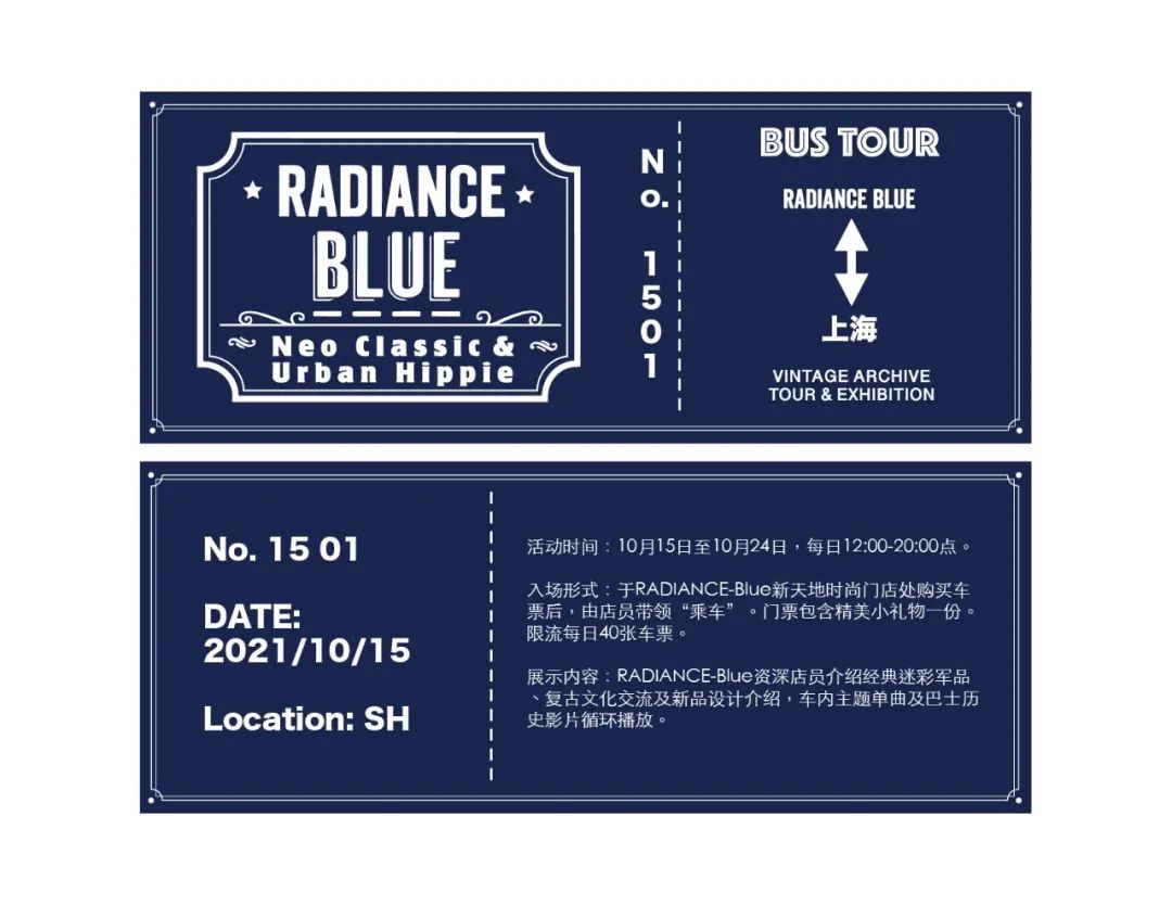 活动时间:10月15日至10月24日,每日12:00-20:00点。 入场形式:于RADIANCE-Blue新天地时尚门店处购买车票后,由店员带领“乘车”。门票包含精美小礼物一份。限流每日40张车票,分8时段进行,每时段至多5人。
