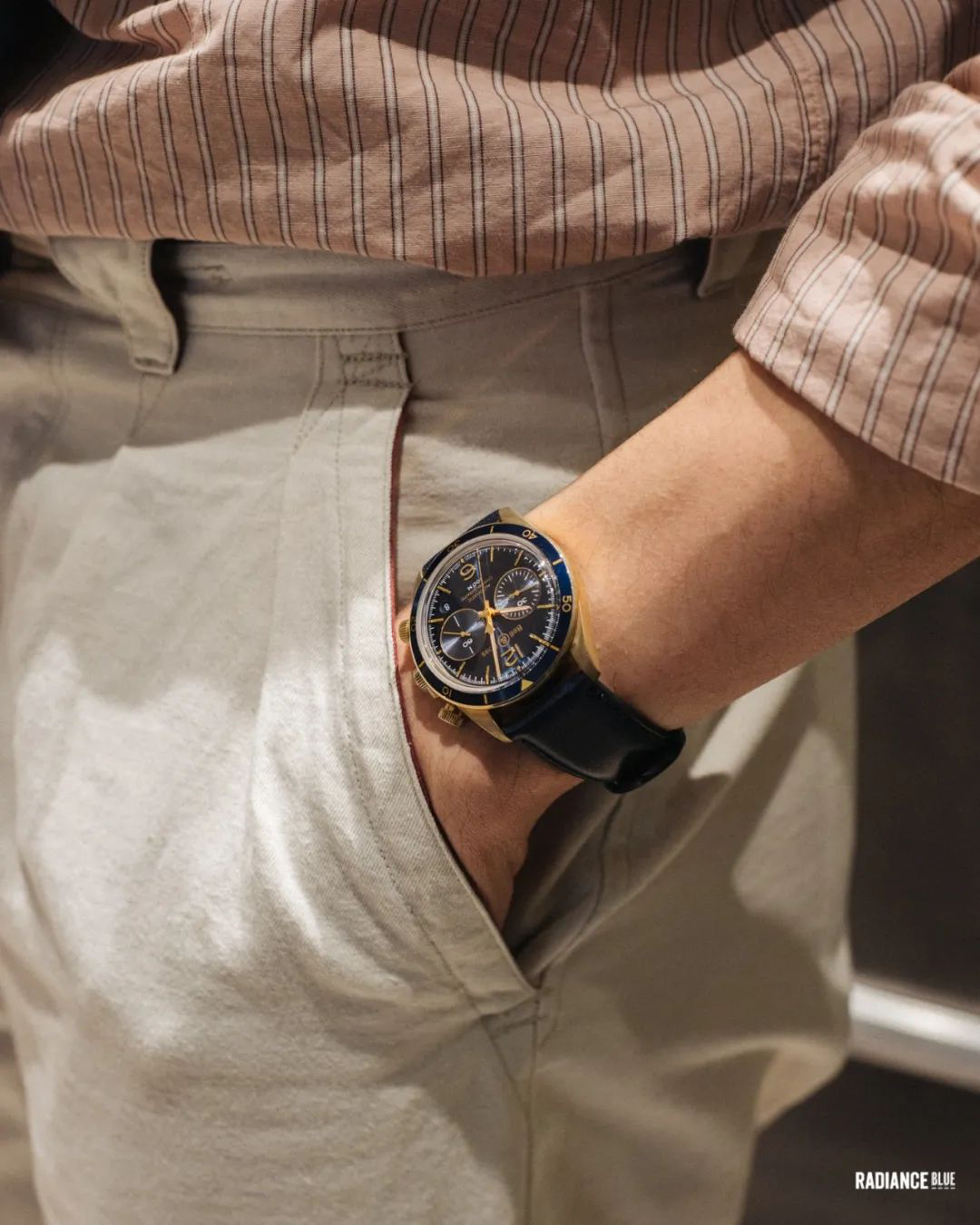 表带:蓝色小牛皮配橙色衬里