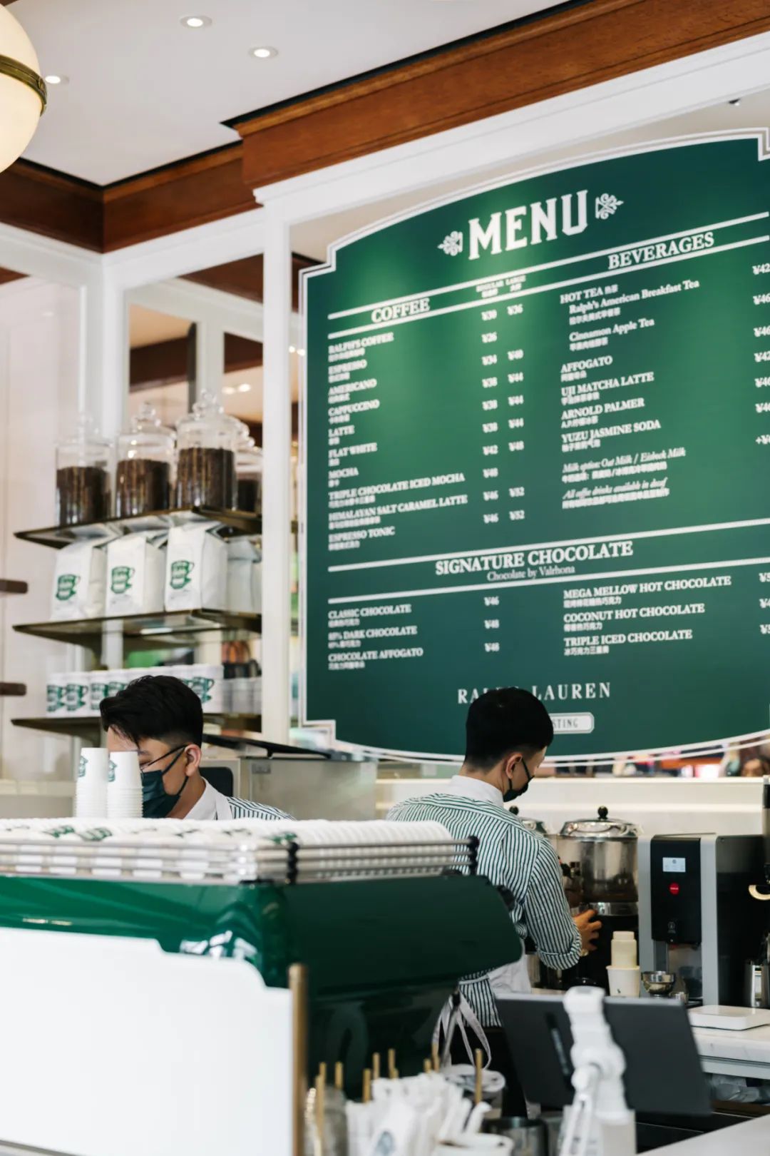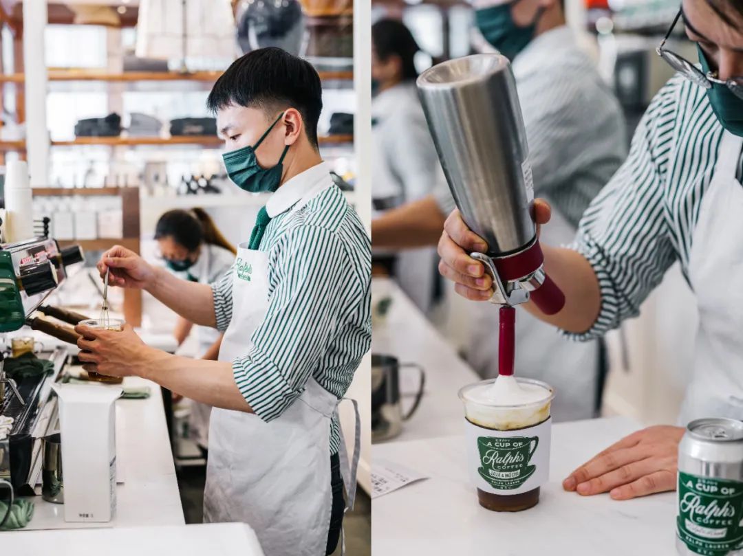 Ralph‘s Coffee 给我感觉不像新店,反而有种怀旧的质感,店内售卖的咖啡豆,都是 Ralph Lauren 本人根据自己口味调配,并由 La Colombe 团队冲泡。