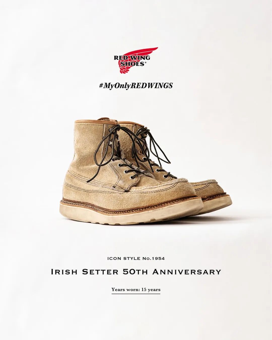 在2006年前后Red Wing JP发售了日本限定的「IRISH SETTER Canoe Moc Suede 50th Anniversary」,前Red Wing JP社长铃木理也专门复刻了这款Canoe Moc来纪念在1952年(也有一种说法是1954年)首次出现的「IRISH SETTER」logo,也就是大家俗称的“狗标”,让这款Red Wing古早鞋型重新被大家熟知。