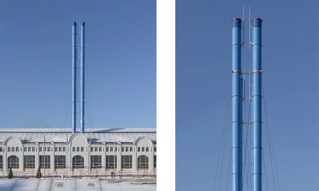 原先的烟囱已被 70 米高的钢制管道所取代,这些管道高耸向更远的空中延伸。
