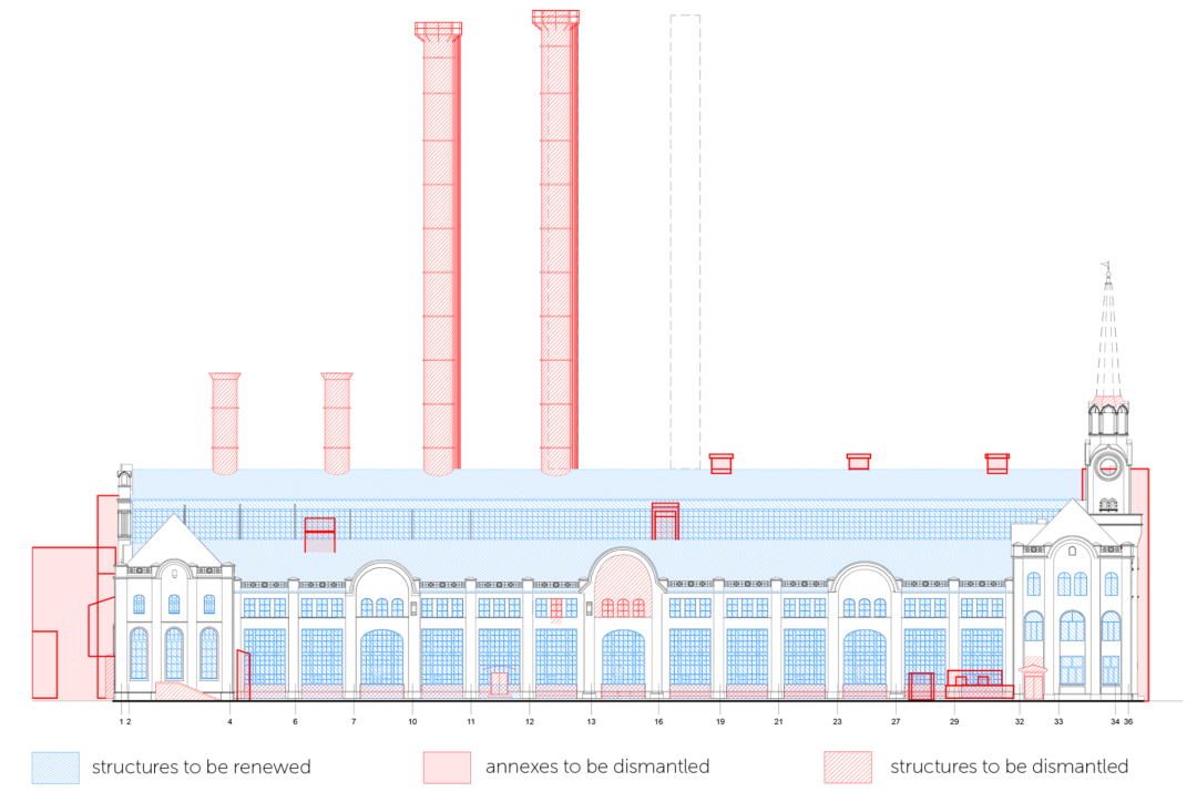 与传统发电站不同,GES-2的外观更具有装饰性。长条双层窗户和尖顶下的五个拱门,在一端装饰有大教堂般的尖顶。