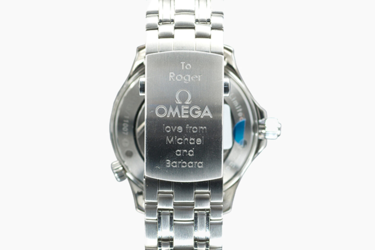 Roger Moore 的 OMEGA Seamaster 300M 于 2012 年制造,仅限 11,007 枚。腕表的不锈钢表扣上刻有独家签名,即 “To Roger love from Michael and Barbara” ,暗示这是邦德制片人 Michael G Wilson 和 Barbara Broccoli 赠予的礼物。除了个人印记外,腕表还配备 41 毫米不锈钢表壳,黑色表盘周围环绕有黑色陶瓷表圈,整个表盘重复 “007” 图案。开放式表背展示了带日历功能的 2507 型自动机芯,其转子上还有邦德经典的枪管图标和一颗子弹。据悉,Roger Moore 的这枚 OMEGA Seamaster James Bond 50th Anniversary 腕表将于 10 月 4 日起通过 Bonhams 进行拍卖。