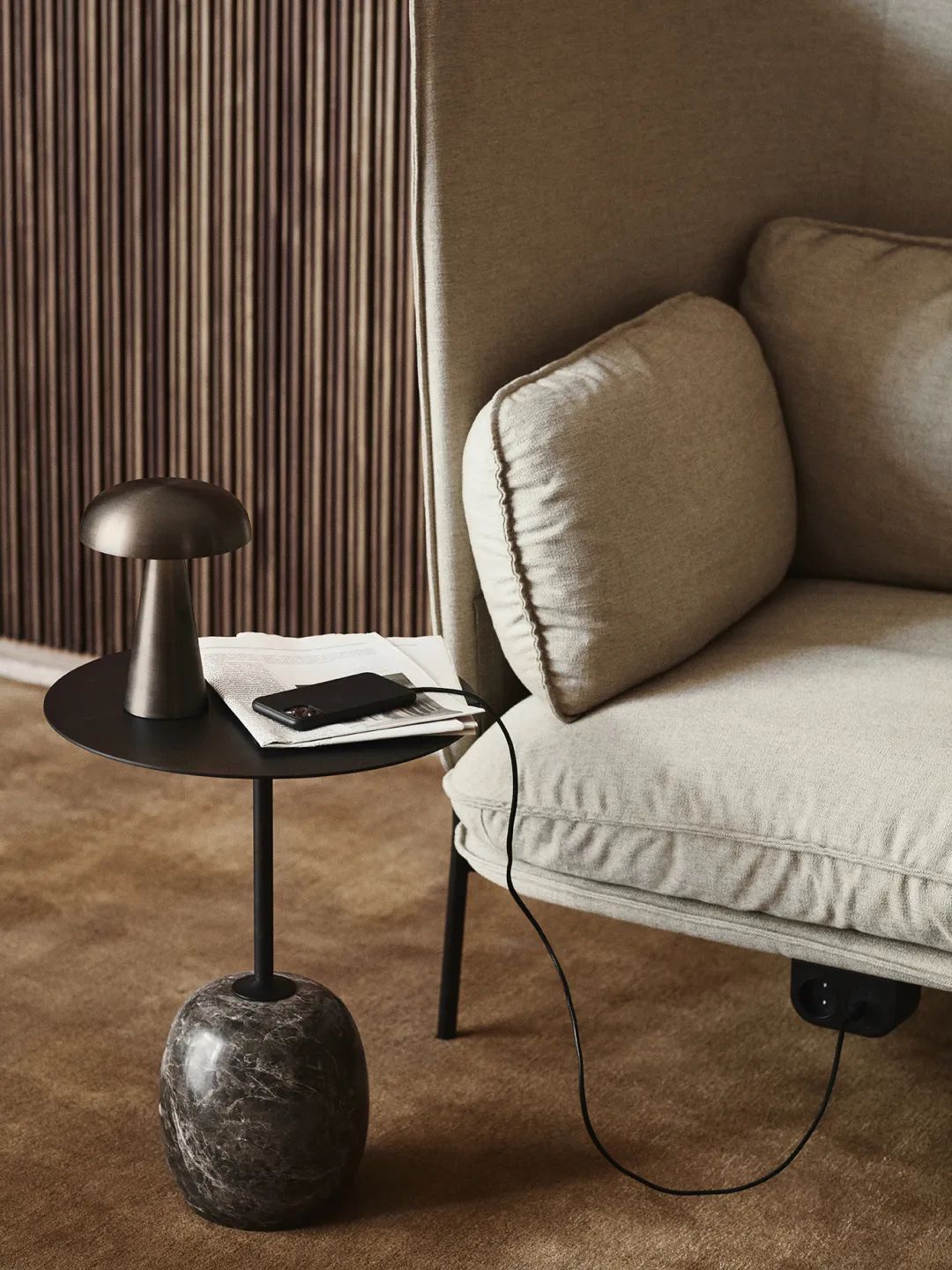 除了主照明的吊灯外,沙发侧边放置落地灯、边几上摆一盏造型前卫的台灯,都是打造氛围的好办法。