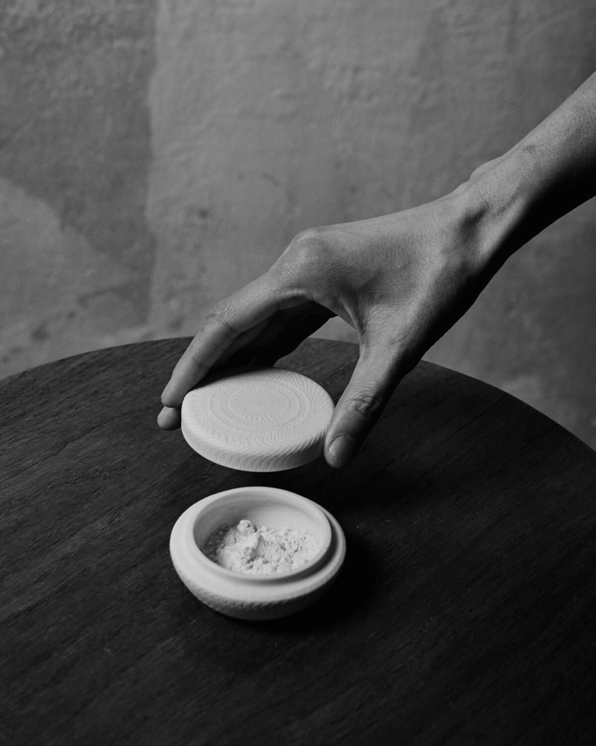 现如今 Ryoko 则对传统香粉进行了改良,并且融入了海藻、乳香、杜松子、罗勒、檀香等众多香味。其中印度的一种精油香味非常难得,因为当地甚至没有交通,需要徒步去。他们现在依然采用非常古老的方式去制作,几乎已经快失传了,所以不但昂贵而且非常费时。