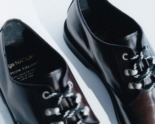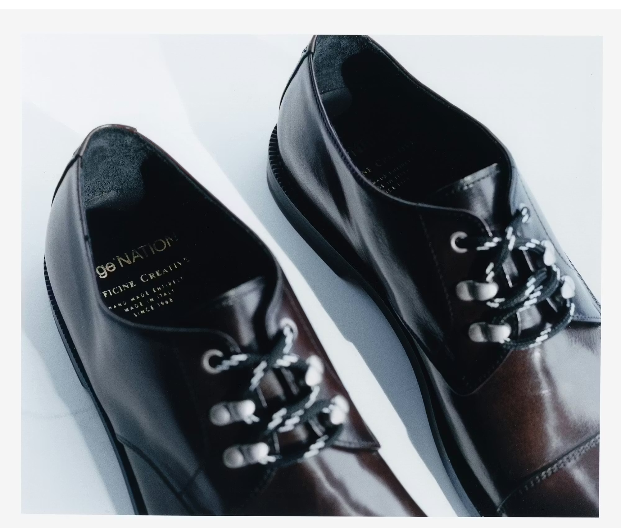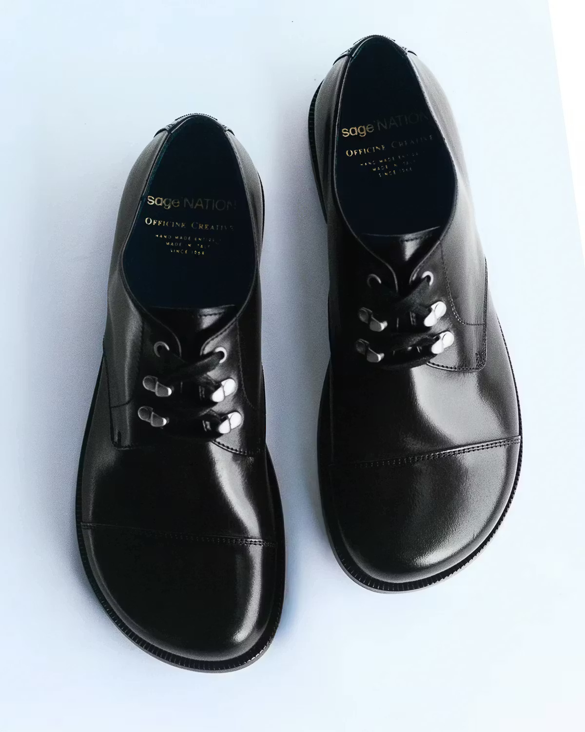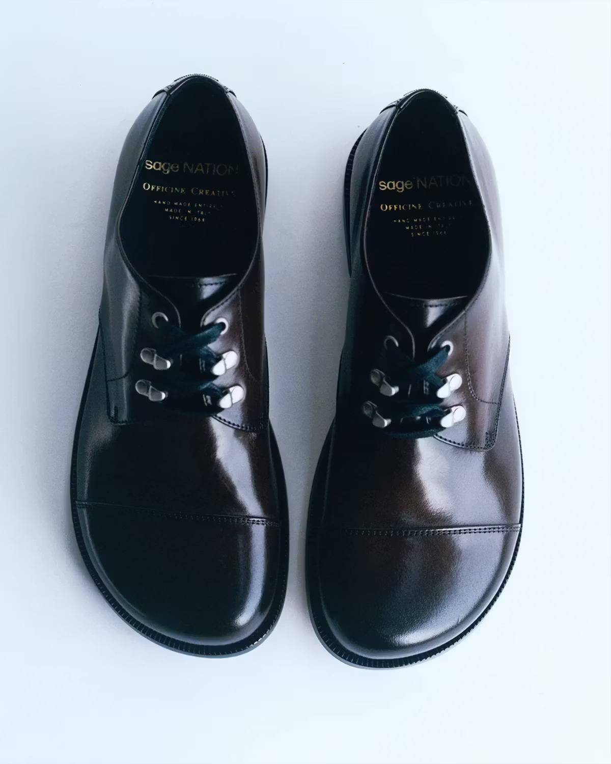 Sage Nation 的首款鞋履由意大利蒙特格拉纳罗小镇的制鞋公司 Officine Creative 手工制作。这双正装鞋的鞋型相当流畅,采用光滑牛皮鞋面和皮革鞋底。其鞋带穿过源自登山靴的金属鞋带钩(每双鞋都配有黑色棉质鞋带和条纹登山鞋带),纤细鞋身末端略微凸起,鞋头部分则采用类似工装靴的鞋头帽设计。