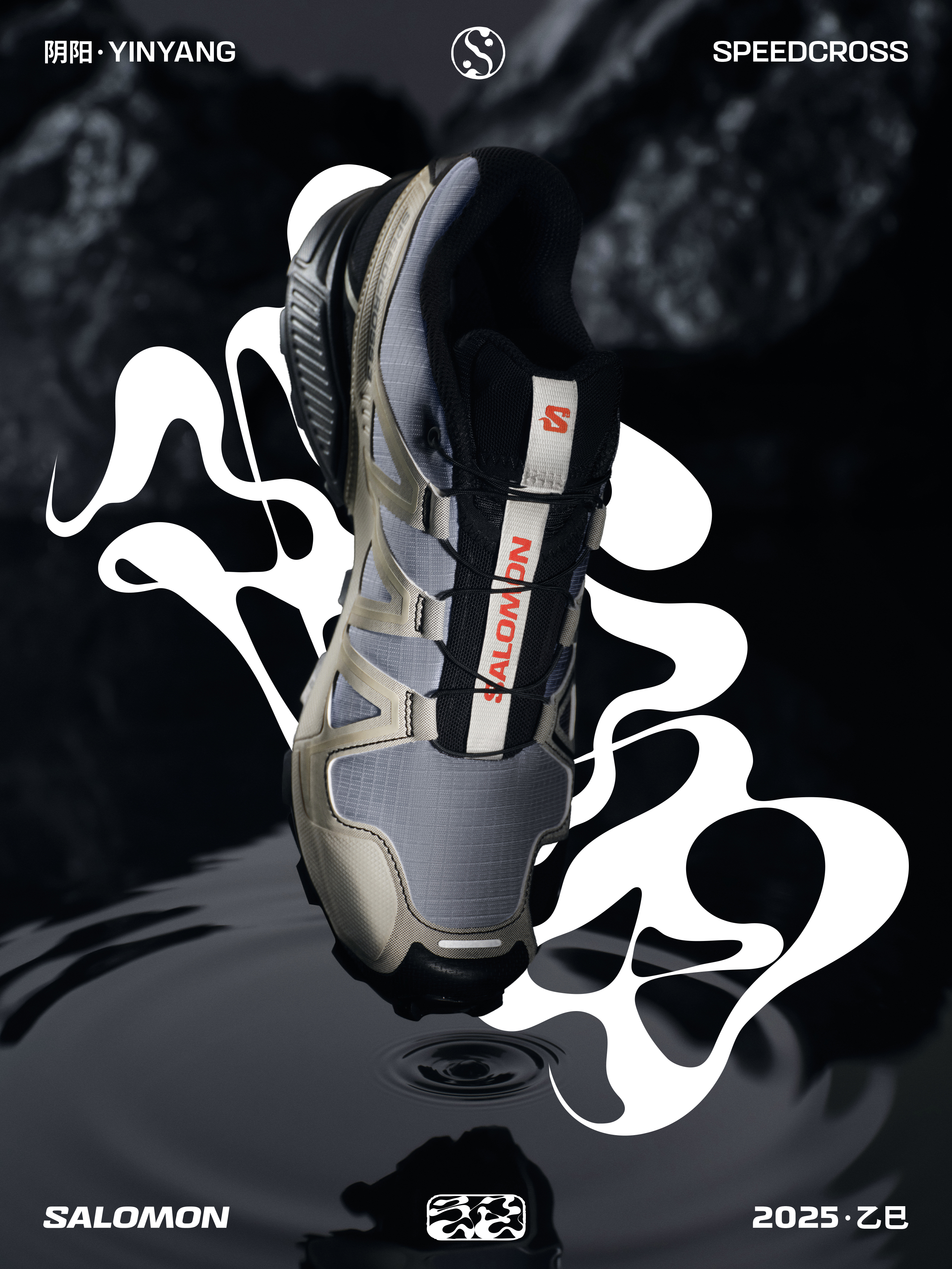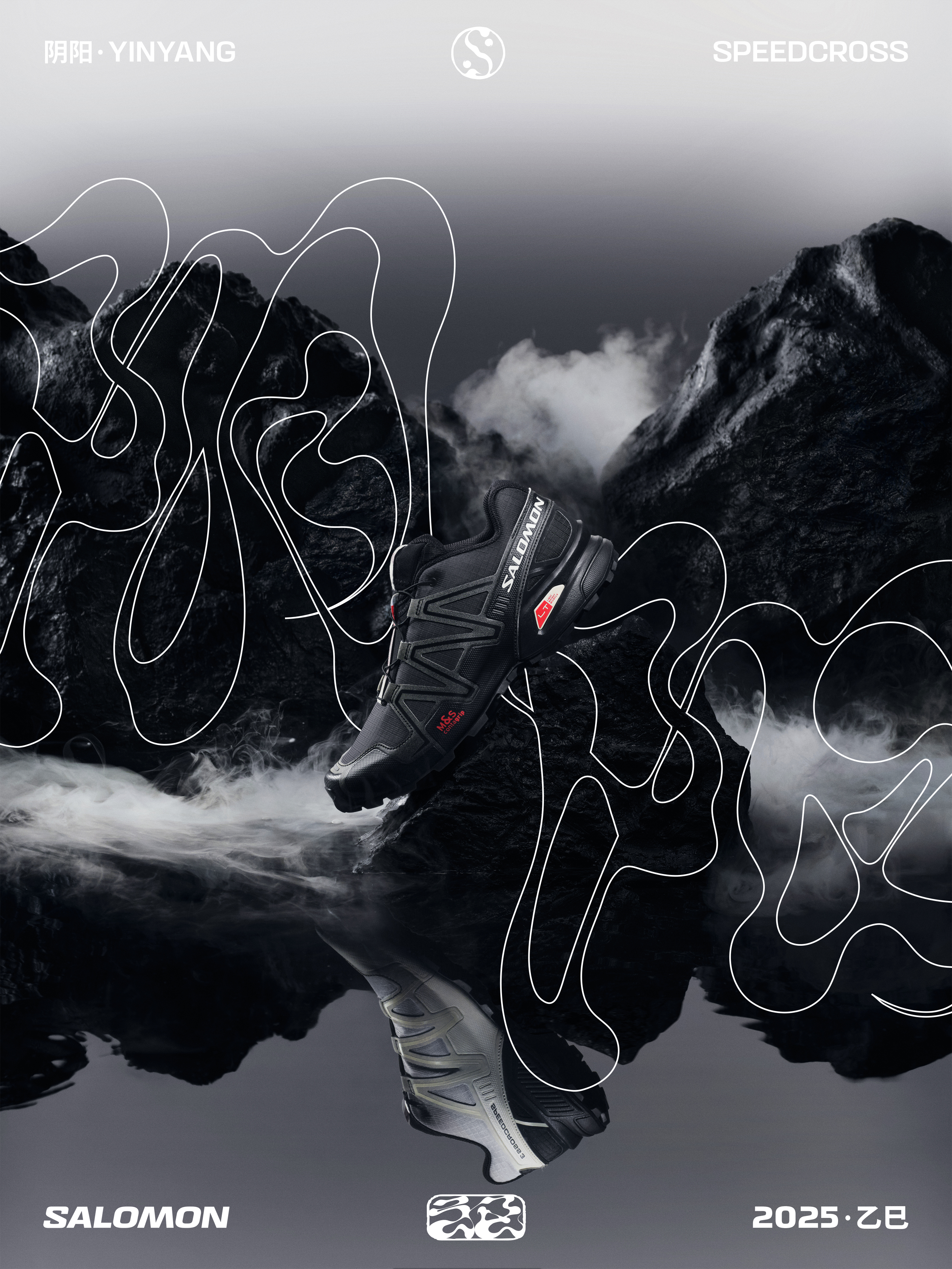阴阳系列以Salomon旗下经典鞋款SPEEDCROSS 3 为蓝本,以由白至黑的渐变手法,呈现阴与阳递进与交融的哲学意境。双足采用镜像对称设计,构建独特视觉张力。两侧鞋身的Sensifit™包裹系统以蜿蜒流线形态演绎蛇类的敏捷与优雅,鞋身外侧与鞋舌织带处更缀有红色细节,点亮鞋款灵动特质,诠释刚毅与柔美的动态平衡。