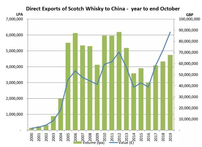 再到2019年,苏格兰威士忌全年出口总值49.1亿英镑,比创记录的2018年竟又再增长2.08亿英镑,达到同比4.4%的增长率,出口中国总额8800万英镑,创下最高记录!