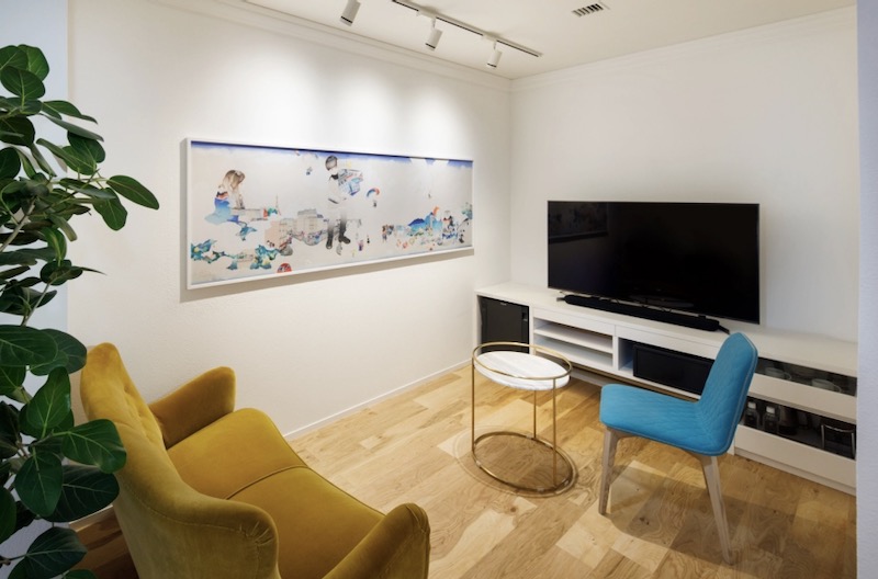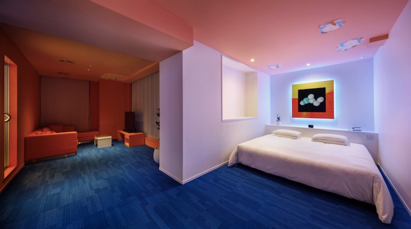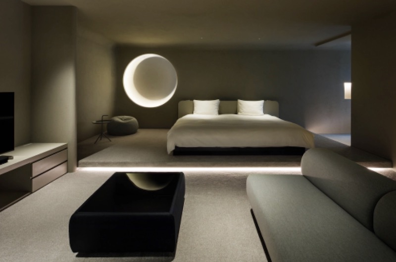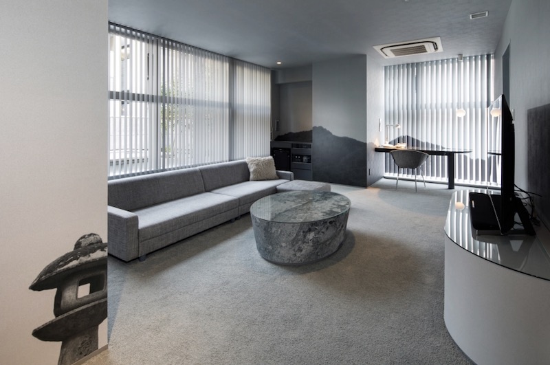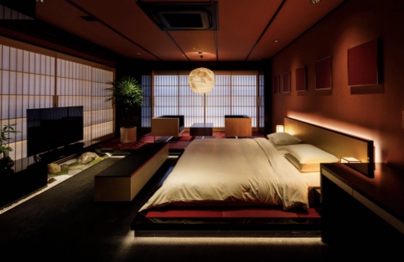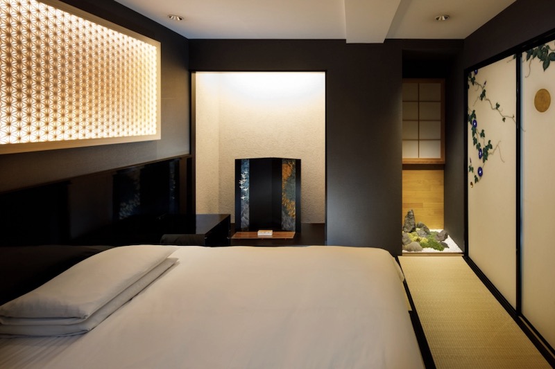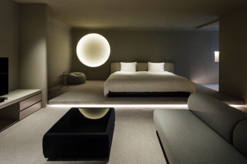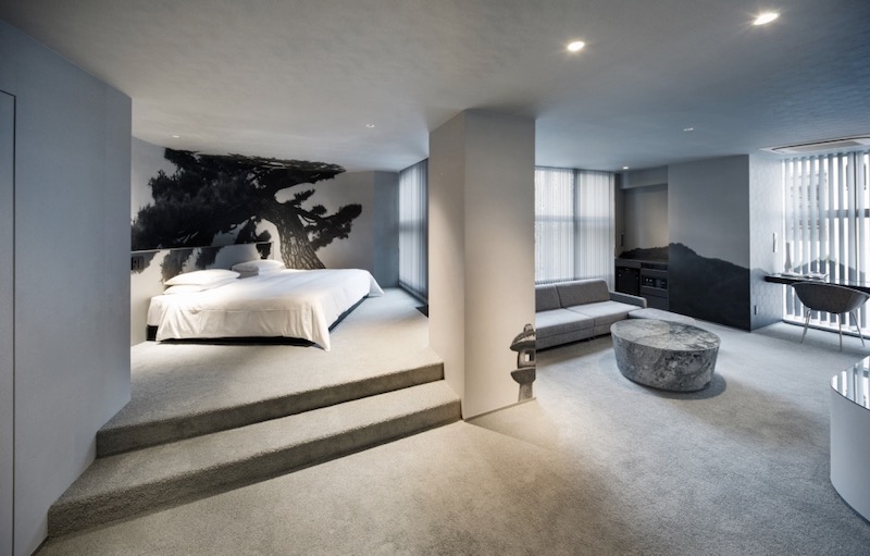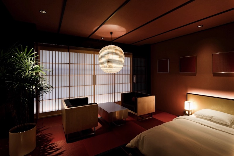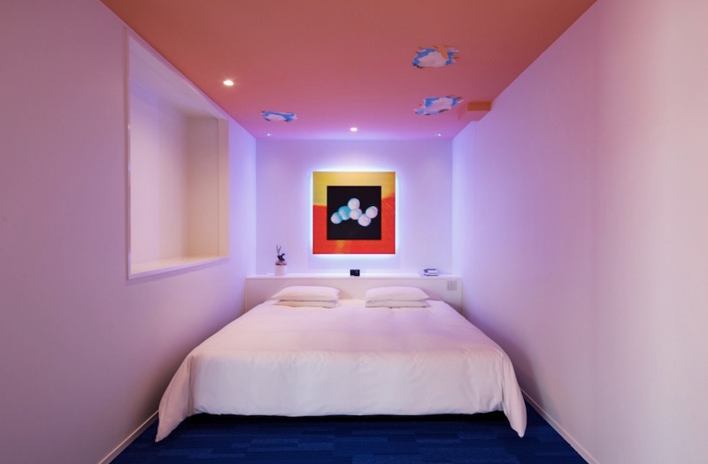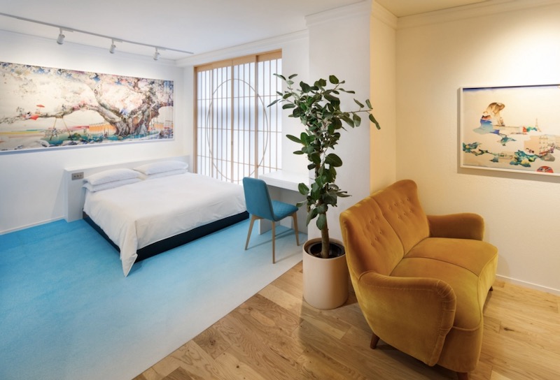 诸如 Room 103 ,以 “Moon Phases” 为名,由建筑师 Kubo Tsushima 设计。顾名思义,103 室旨在展示月球的各个阶段,并为住客提供宁静而适合沉思的空间。Room 101 由日本画家 Tetsuei Nakamura 设计,这是一个很大程度上受日本文化启发的房间,原始的绘画将人的思绪拉回到江户时代的日本。经工匠 Naoki Ishibashi 之手的 Room 102 采用稀有的红色榻榻米和软草打造而成,从而为传统的和室创造了新的面貌。还有极富京都韵味的 Room 202 ,来自建筑师 Hideyuki Nakayama 。当然 Room 302 也不错,视觉艺术家 Ran Tondabayashi 在这里创造了日夜循环过渡的超现实意境。若要体验超越时代的日式现代主义风,Room 402 会是一个不错选择。由艺术家和版画家 Asuka Irie 打造,拥有色彩缤纷的家具和精巧的原始绘画,它们创造了一种有趣的平衡,让人感觉似乎是睡在了美术馆中。