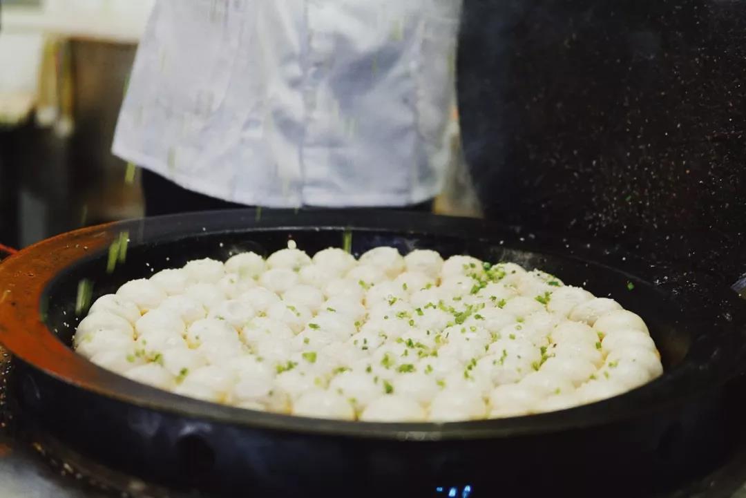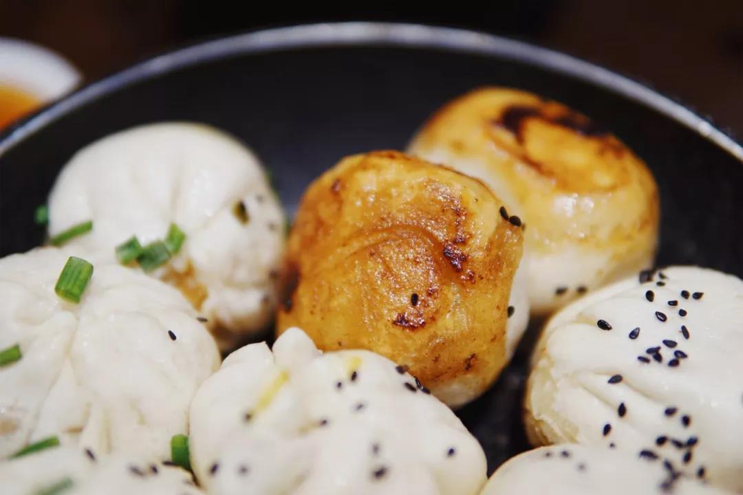 上海生煎分为两个流派——清水派褶子向上,混水派褶子向下,区别在于前者不用皮冻,全发面且皮更厚,大壶春做的就是清水生煎。一份小锅生煎拼盘,有蟹粉、鲜肉、大虾三种馅儿,连锅一起上桌,保持温度口感。清水派的生煎面皮松软,底脆不硬,肉馅厚实,吃起来饱足,少一点爆汁快感。