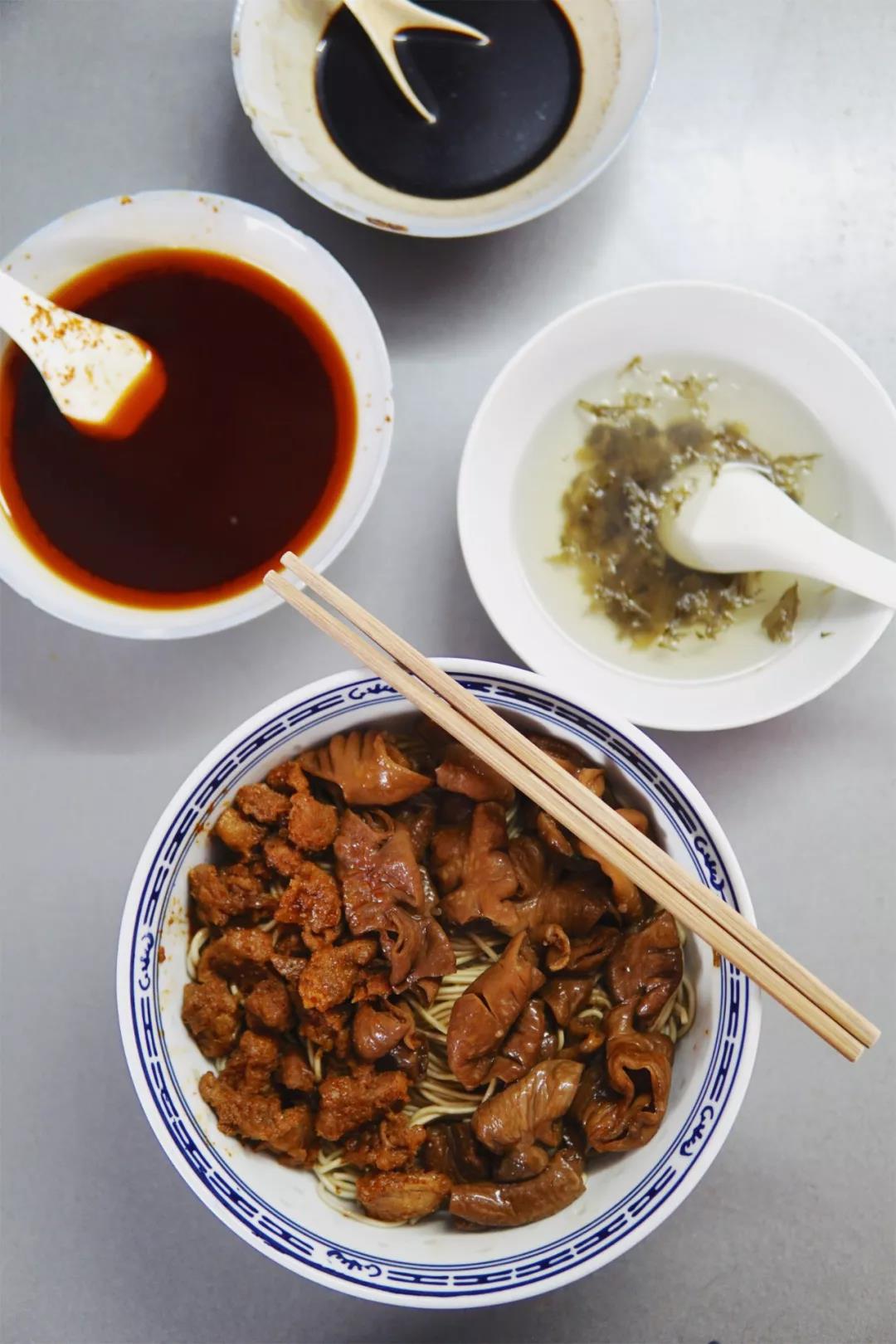 沪上有名的大肠面,小小的店里挤满了吃面的人,还有更多等着吃面的人。一碗干挑大肠面另加辣肉,浇头分量感人,软糯爽滑无异味,面条软硬适中,酱汁一拌,嗦起来鲜浓无黏糊感。吃面的时候,聊起郭德纲的相声,说到于谦老父亲每日起床,早饭一盘大肠,哈哈哈哈哈哈有身份的吃法。