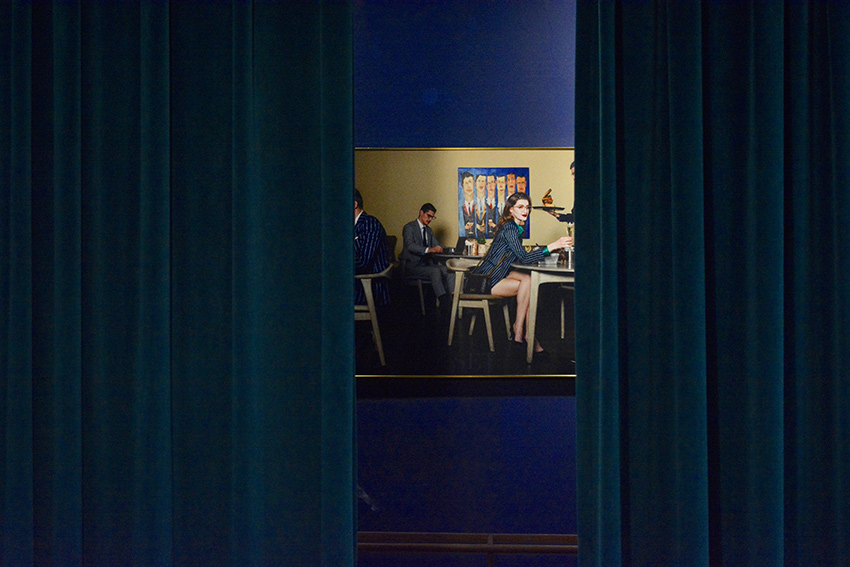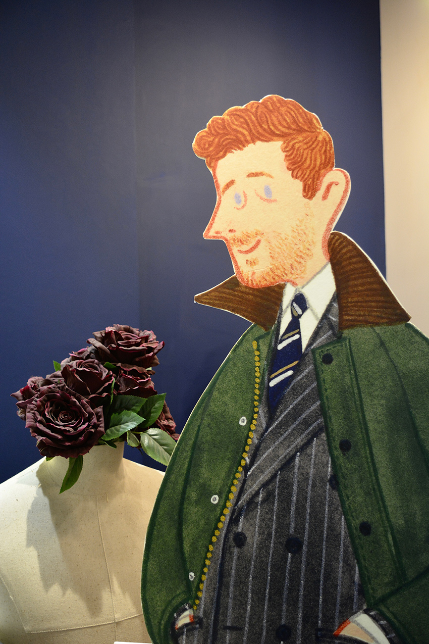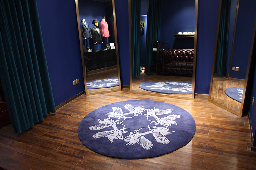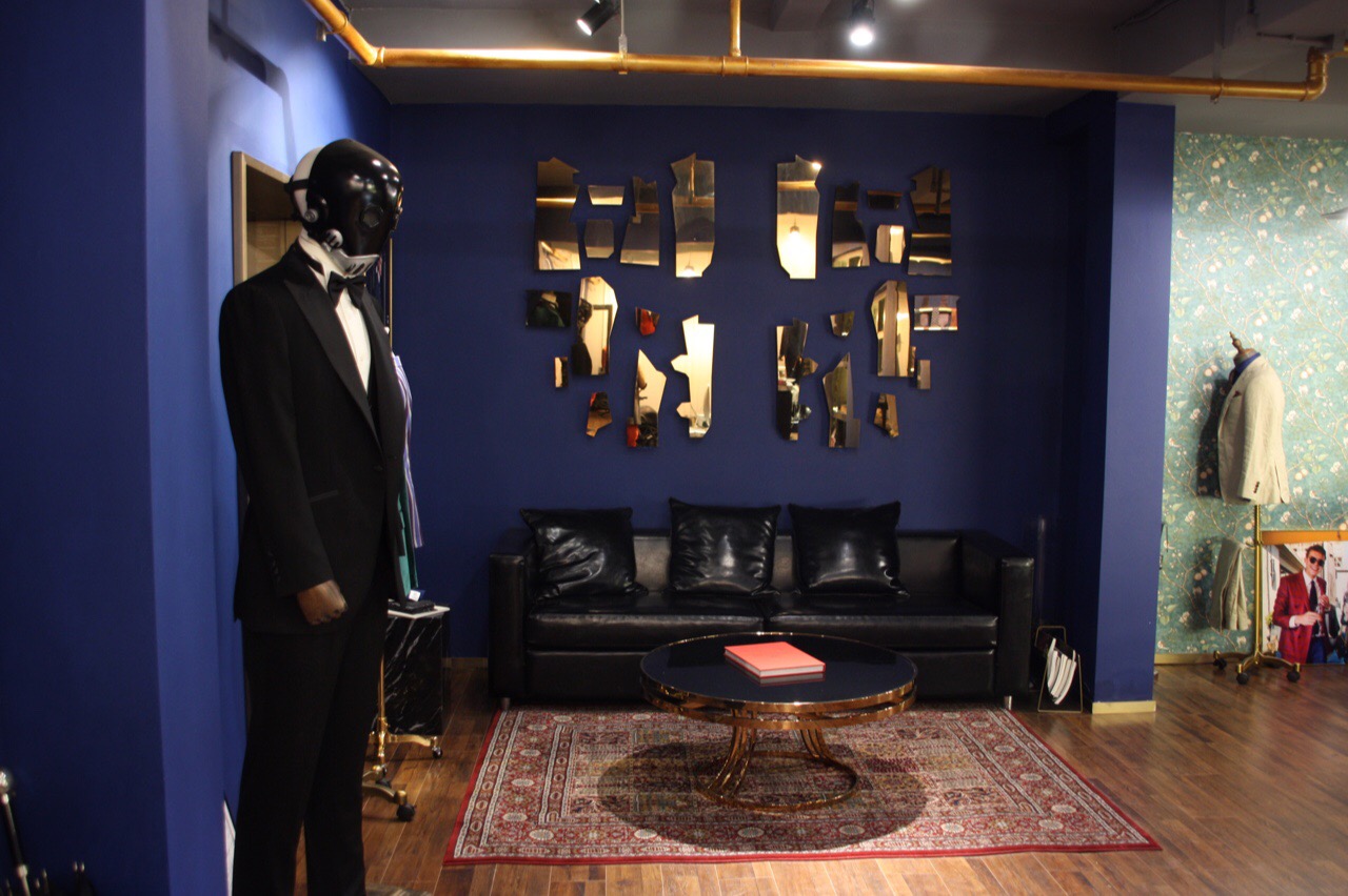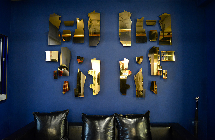 走进店铺内,立马被一种经典的英伦风格包围。黄铜色的金属装饰与纯黑的皮质沙发,在蓝色墙面的呼应之下,碰撞出一种别样的优雅。再往里,是提供定制服务的区域,三块落地镜,可全方位观察衣物的上身效果。店内铺满各种西装以及西装相关的配饰,骨子里就透露着一种精致。