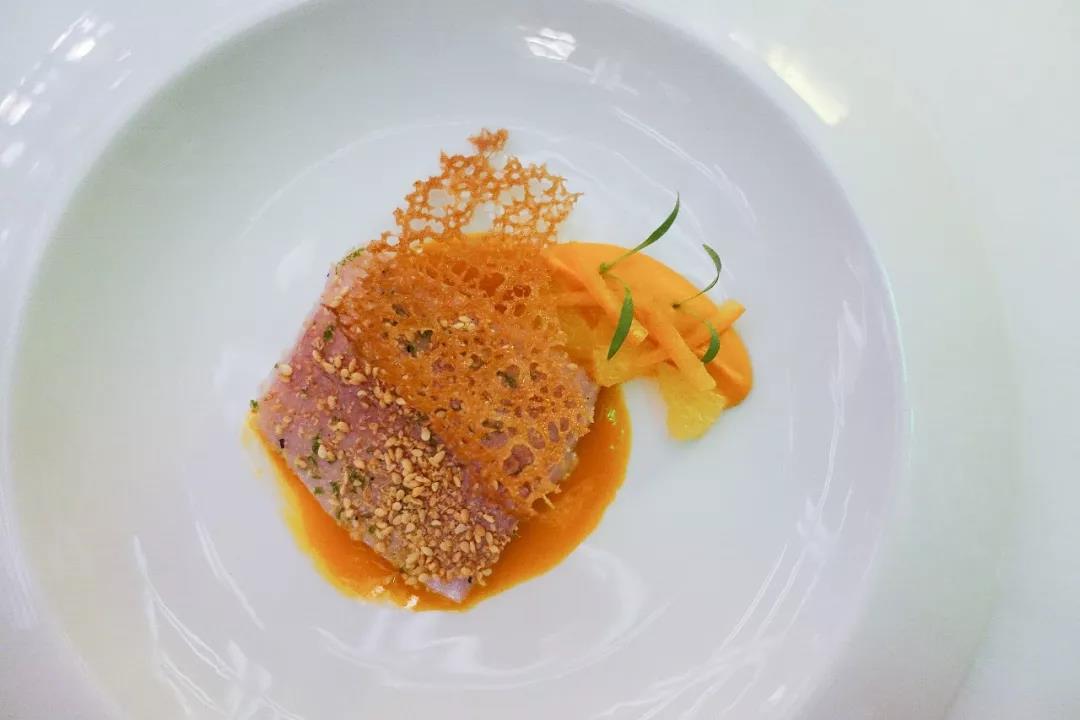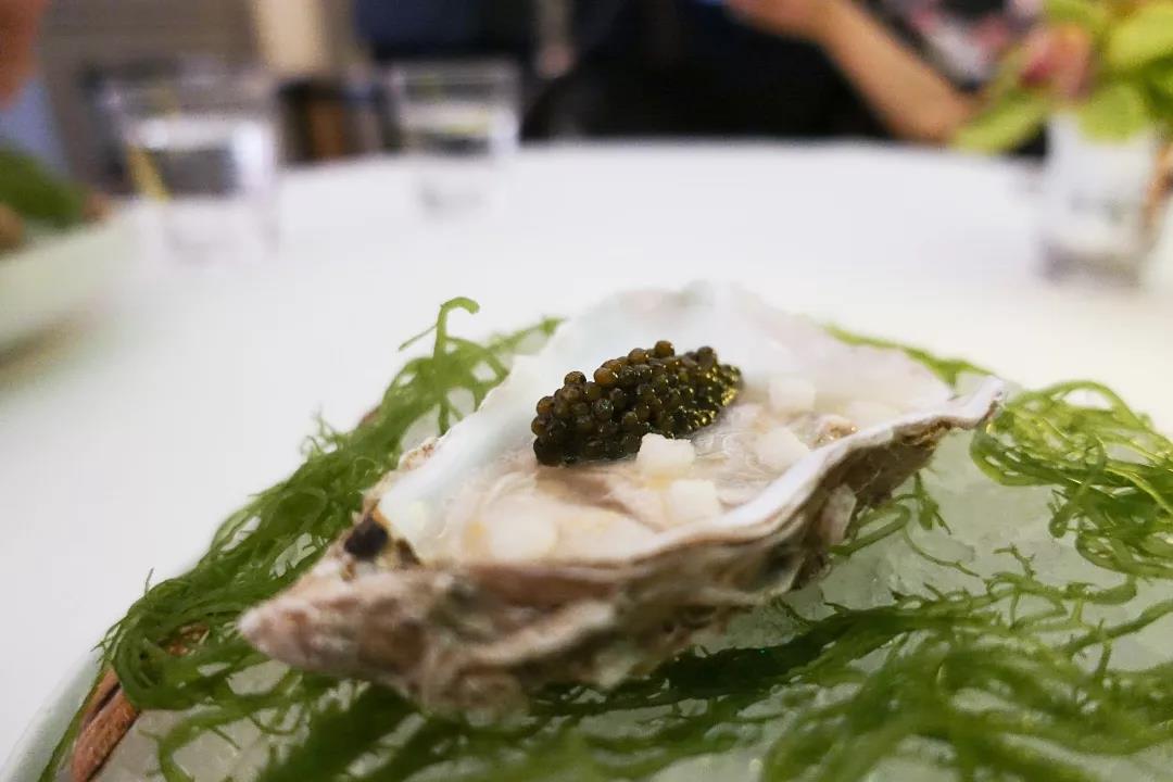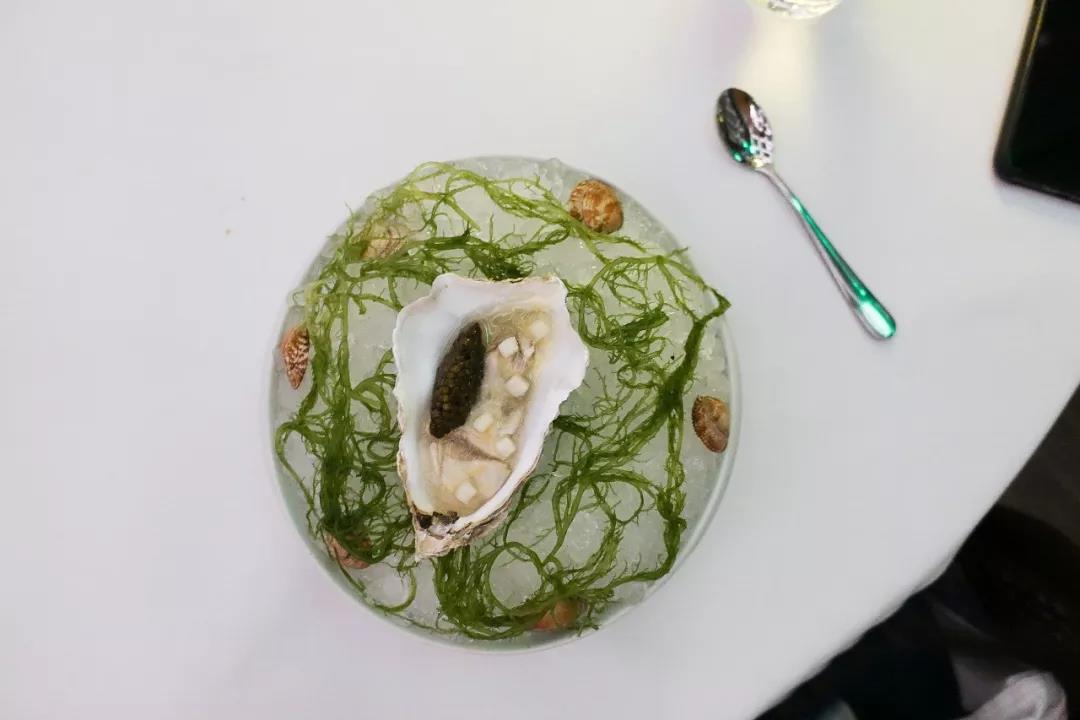 生蚝轻微烹煮,搭配雪梨啫喱,附赠一 kuai 卡露伽鱼子酱。摆盘和味道设计都是比较流行的餐厅做法,清甜微酸的调子让生蚝的海水味更好入口。