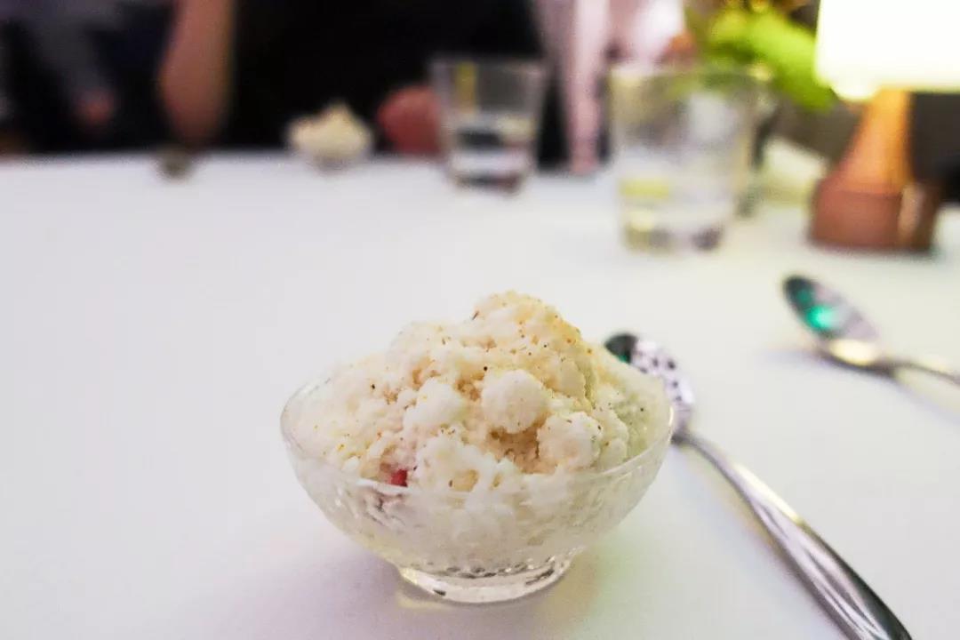 餐后小甜品,一小杯刨冰上面撒桂花,下面是车厘子雪葩。