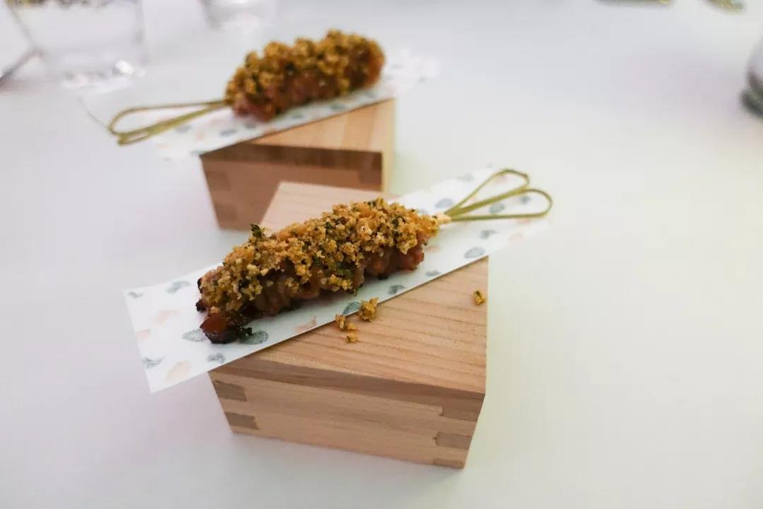 Odette 的泰式咖喱鲈鱼是我吃过的满分鱼料理,这份鳟鱼配辣味胡萝卜泥食材完全不一样,但是灵感上一脉相承,都带有一点点的东南亚风,对辛香料的使用又非常克制,不会压过鱼肉的细腻多汁,好评。同样买一送一,附赠一份鳗鱼烤串。