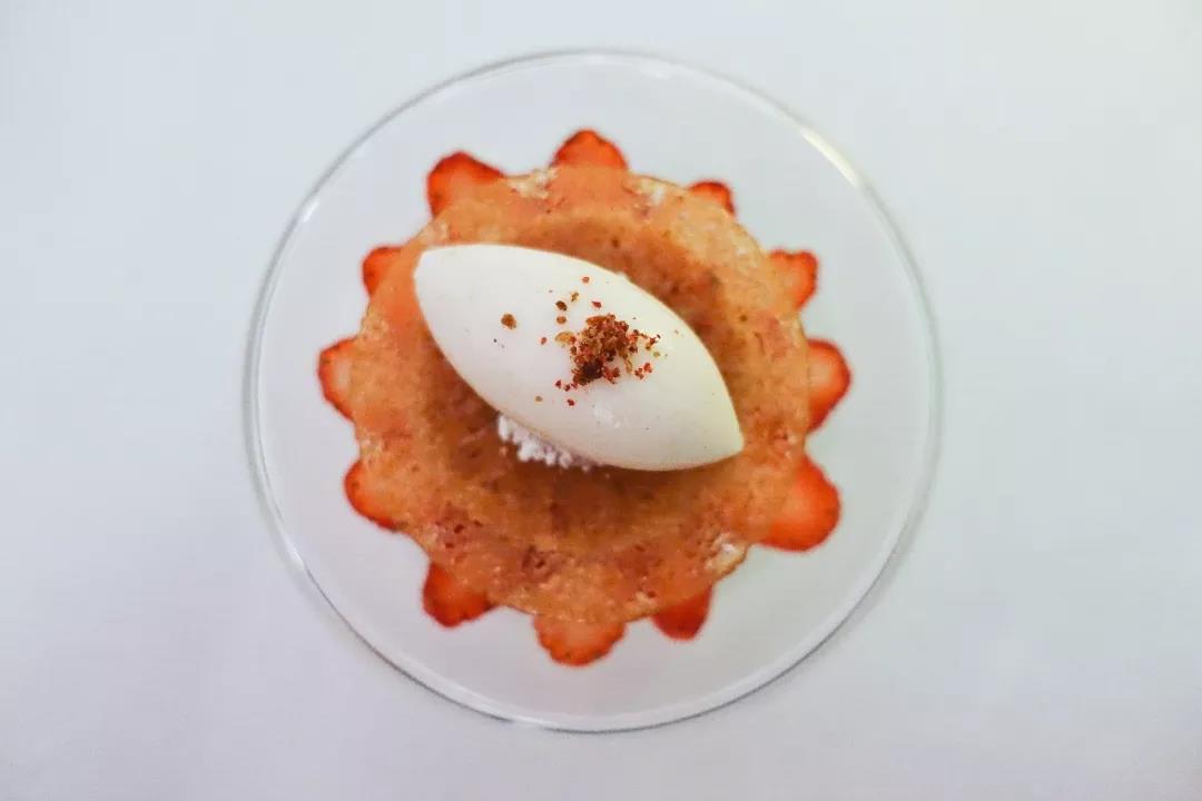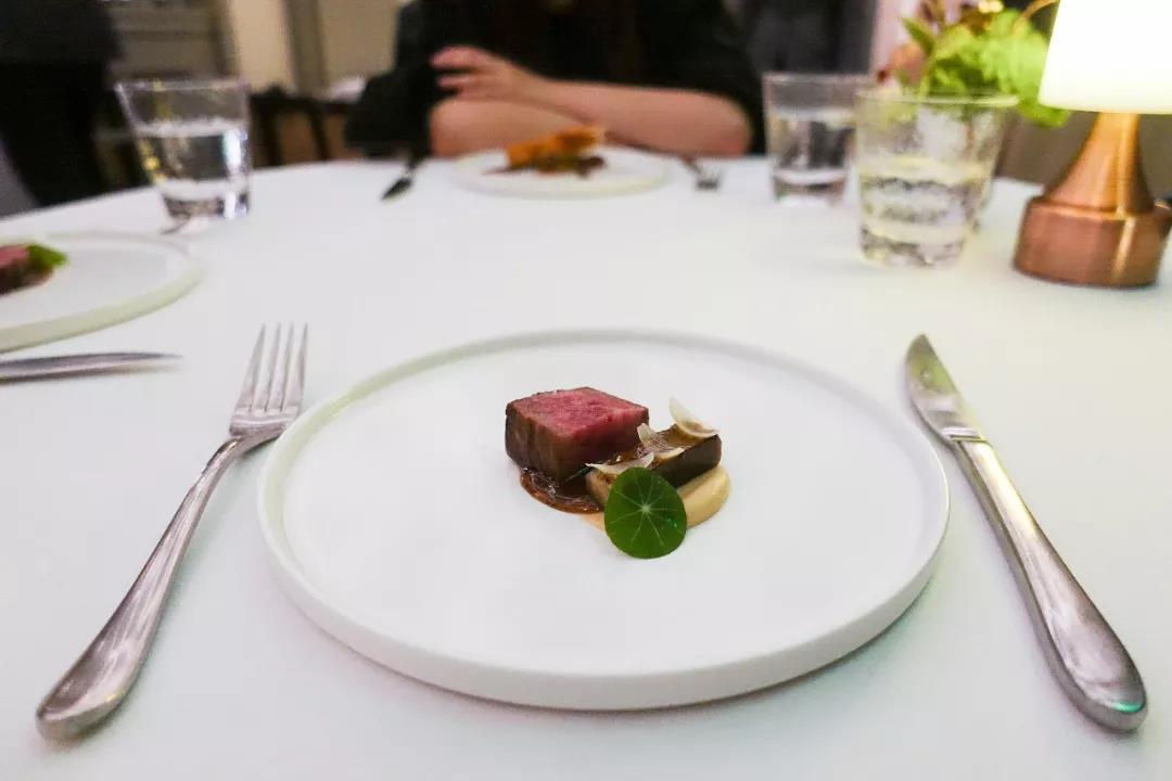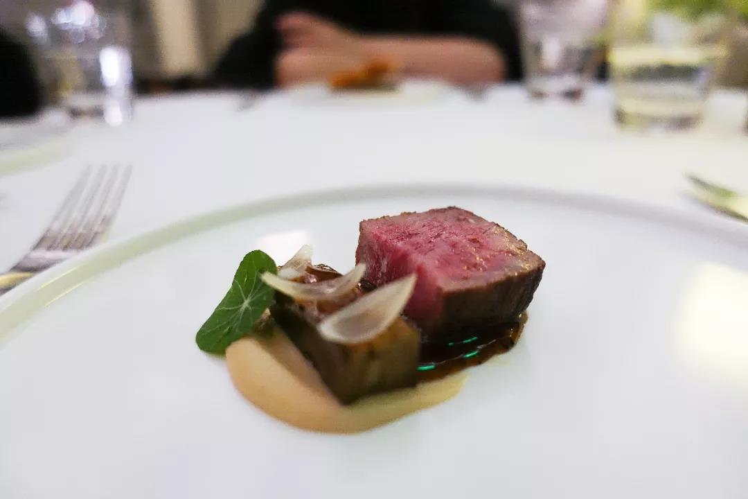 M9西冷,配烤茄子和洋葱泥。造型摆盘朴素,肉很肥还好没什么筋,火候处理得很好,能吃出雪花的肌理和牛油香,酱汁用到台湾马告,增加一点清新的微辣。