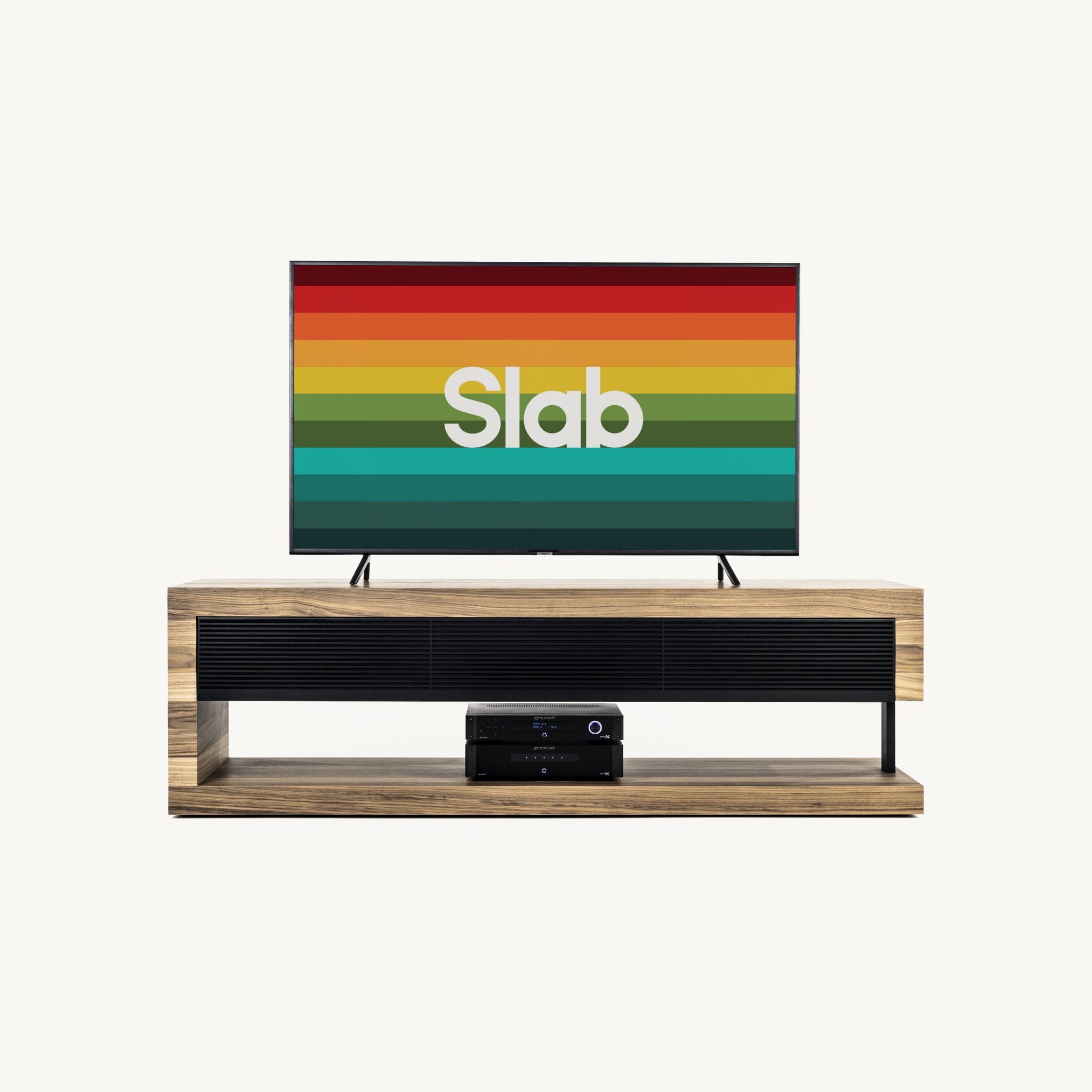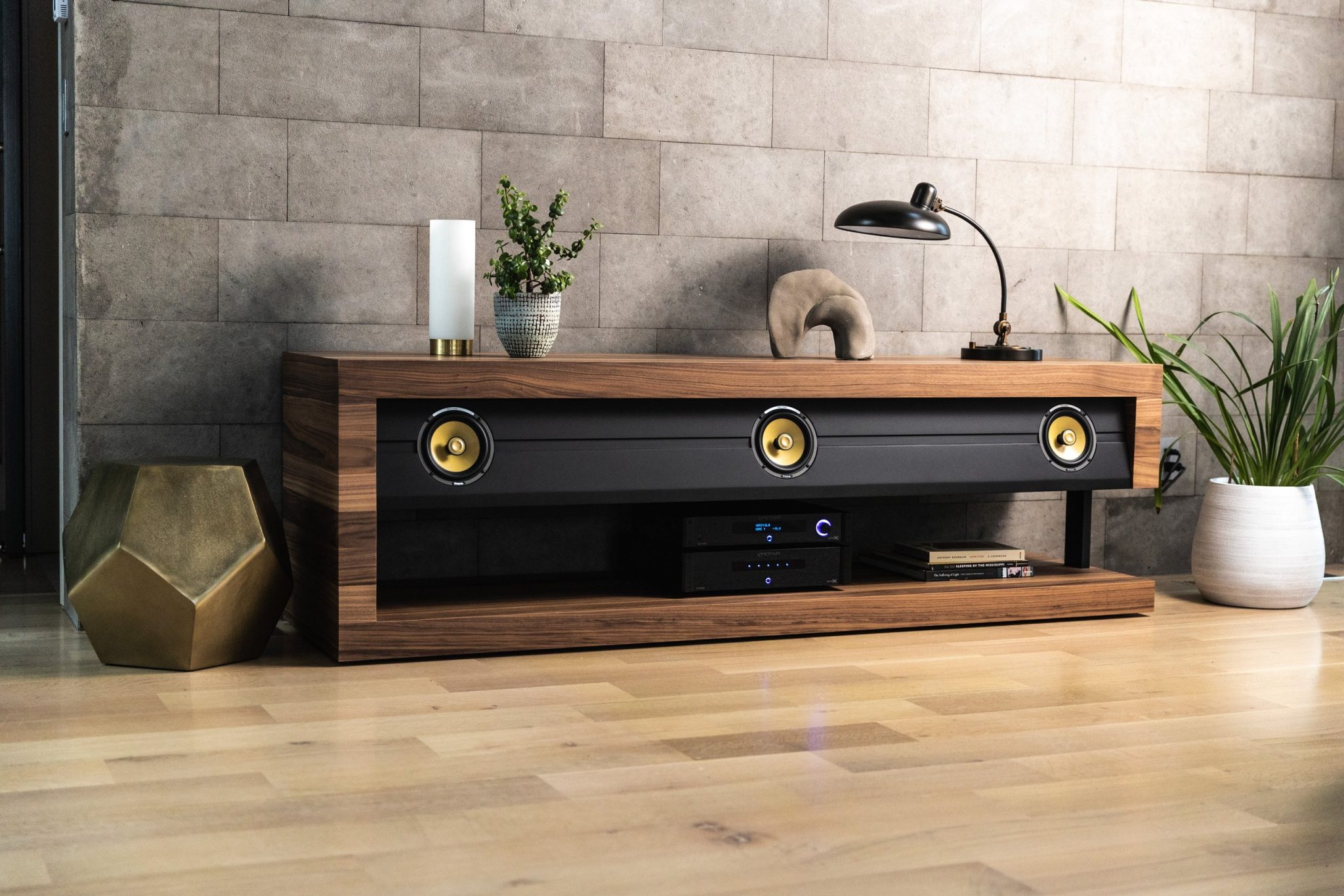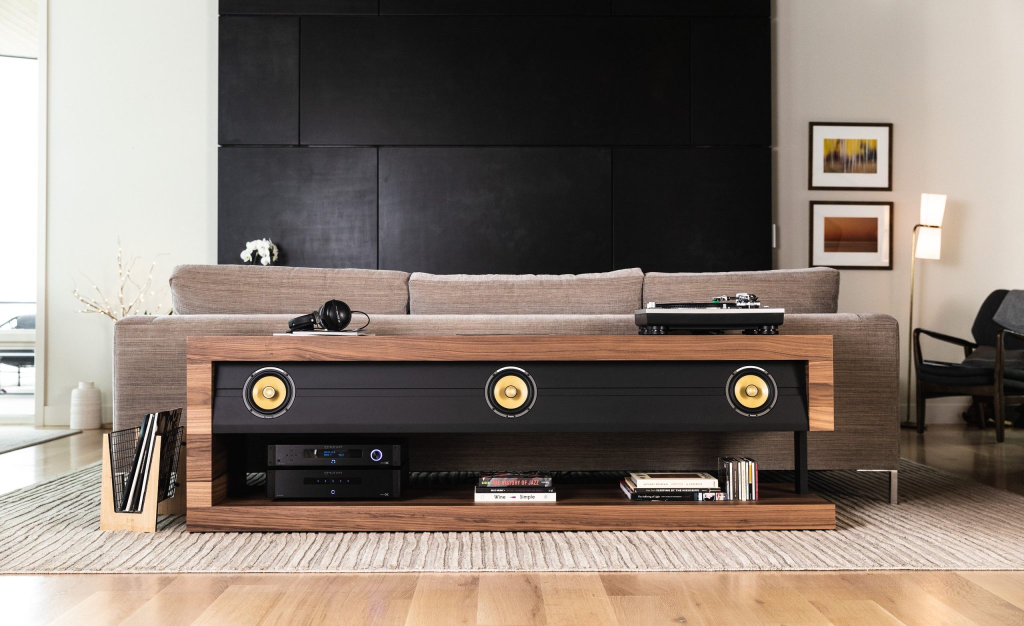 Slab Console却是一个可以把音箱和电视柜融合在一起的音响品牌。正如各位所见,打开前面的黑色条形网,即可看到一整套音响设备被镶嵌在电视柜中,是一款可在不牺牲外观美学的情况下提供高保真音效的音响设备。官方还介绍称,左、中和右声道扬声器以及嵌入式有源低音炮,取代了传统的四个独立扬声器。只需添加您选择的A / V接收器或放大器/处理器组合,即可享受前所未有音效。