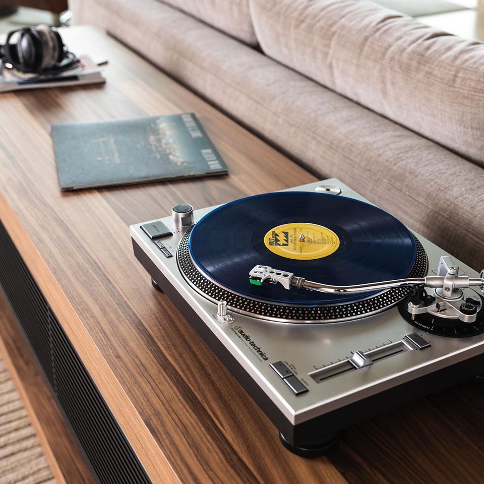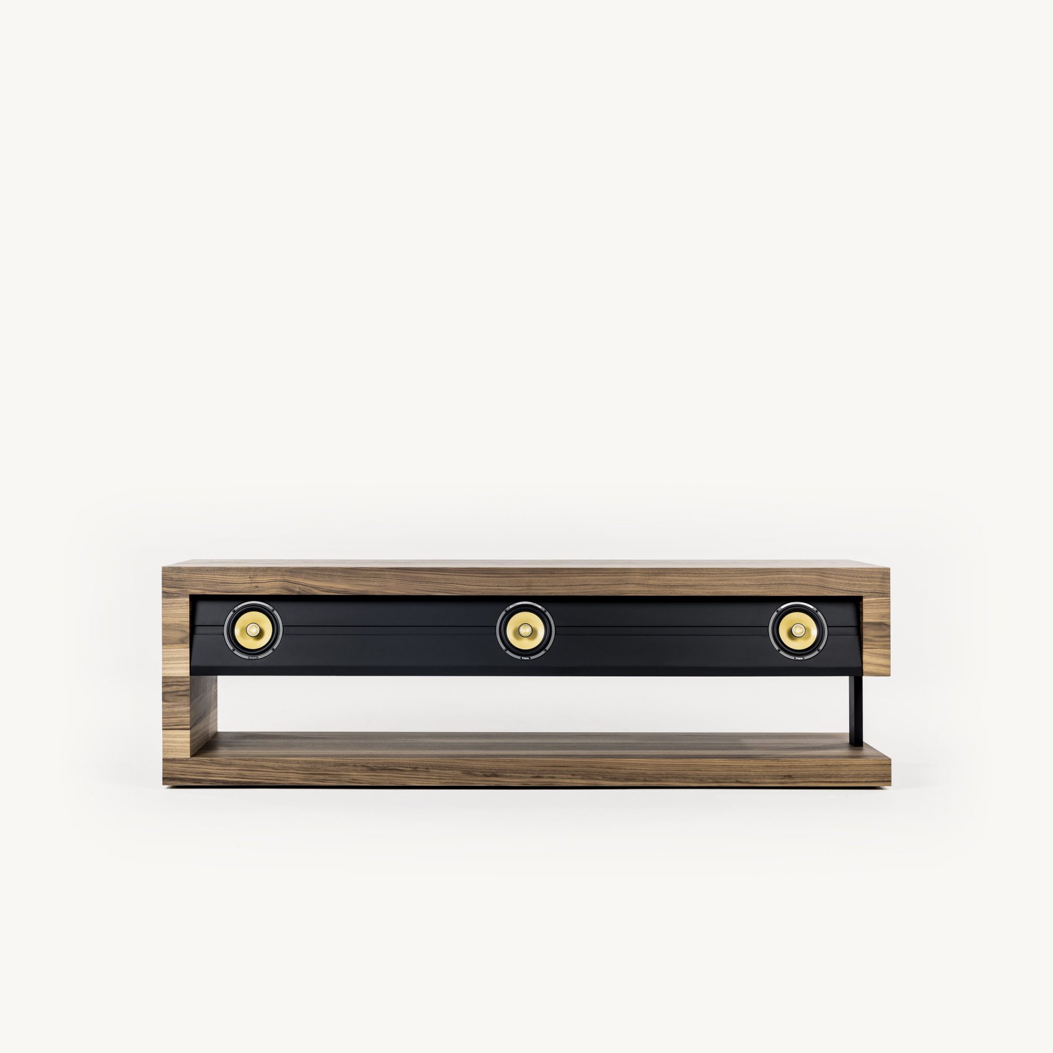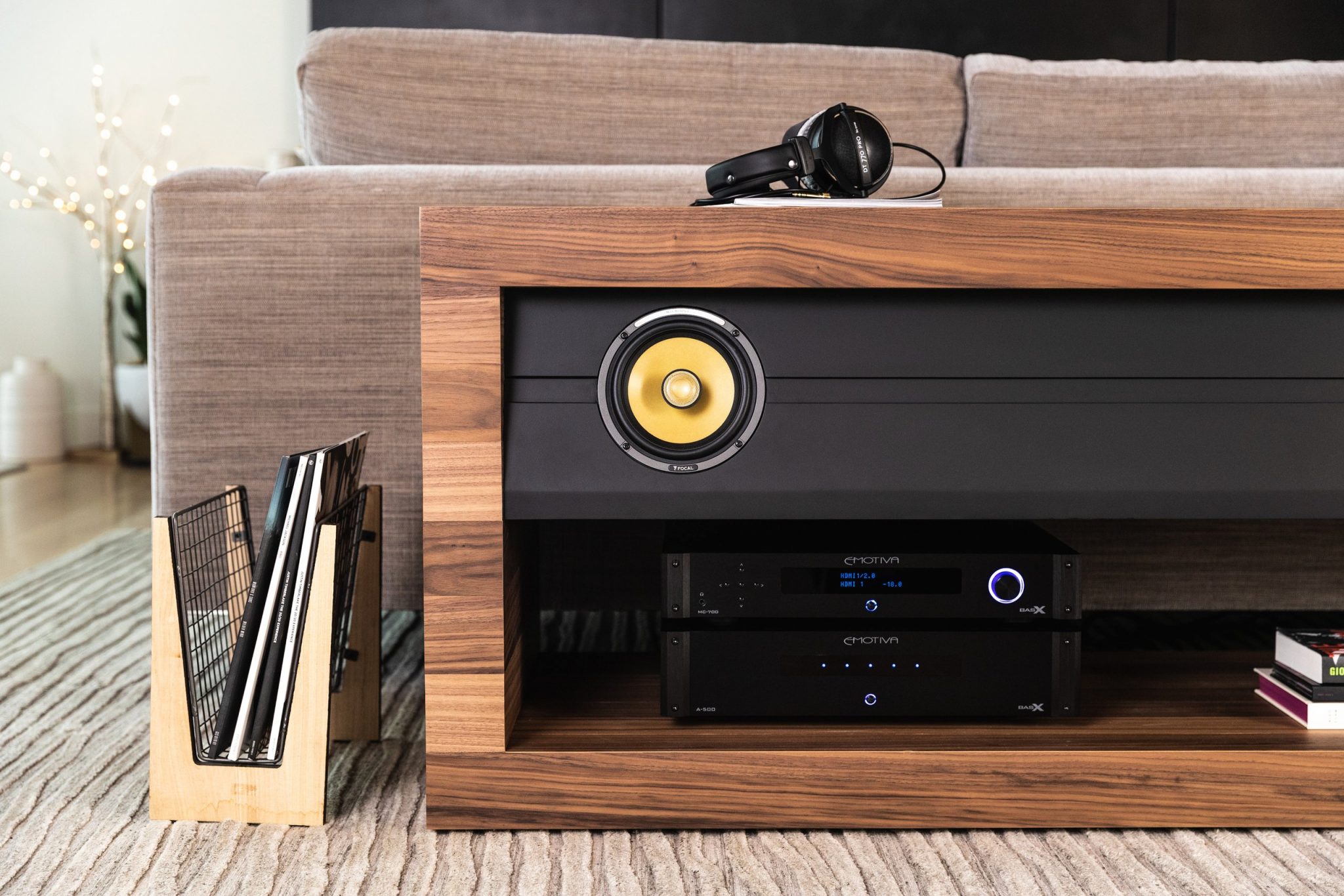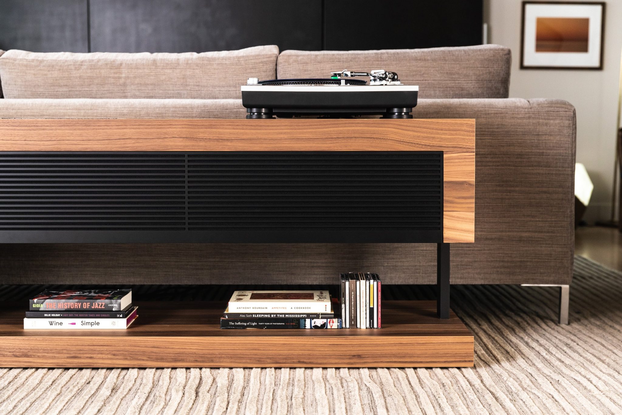 Slab Console却是一个可以把音箱和电视柜融合在一起的音响品牌。正如各位所见,打开前面的黑色条形网,即可看到一整套音响设备被镶嵌在电视柜中,是一款可在不牺牲外观美学的情况下提供高保真音效的音响设备。官方还介绍称,左、中和右声道扬声器以及嵌入式有源低音炮,取代了传统的四个独立扬声器。只需添加您选择的A / V接收器或放大器/处理器组合,即可享受前所未有音效。