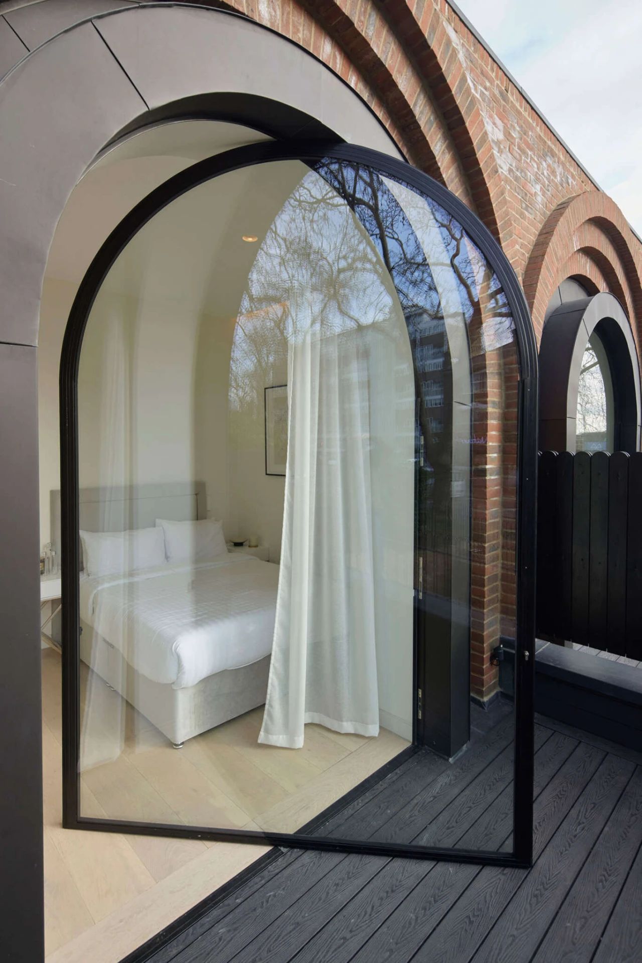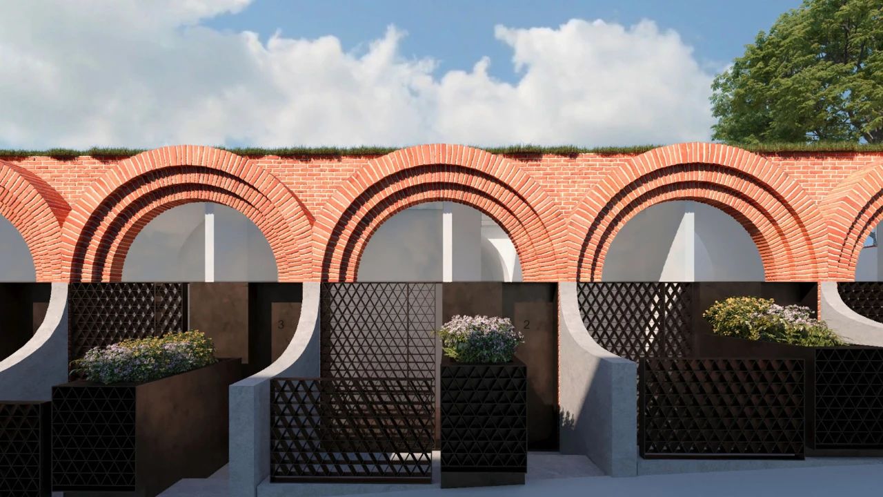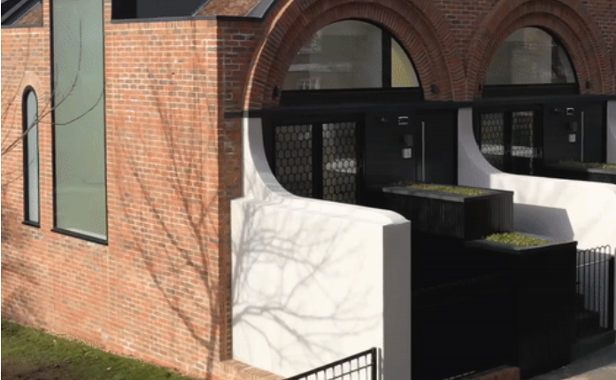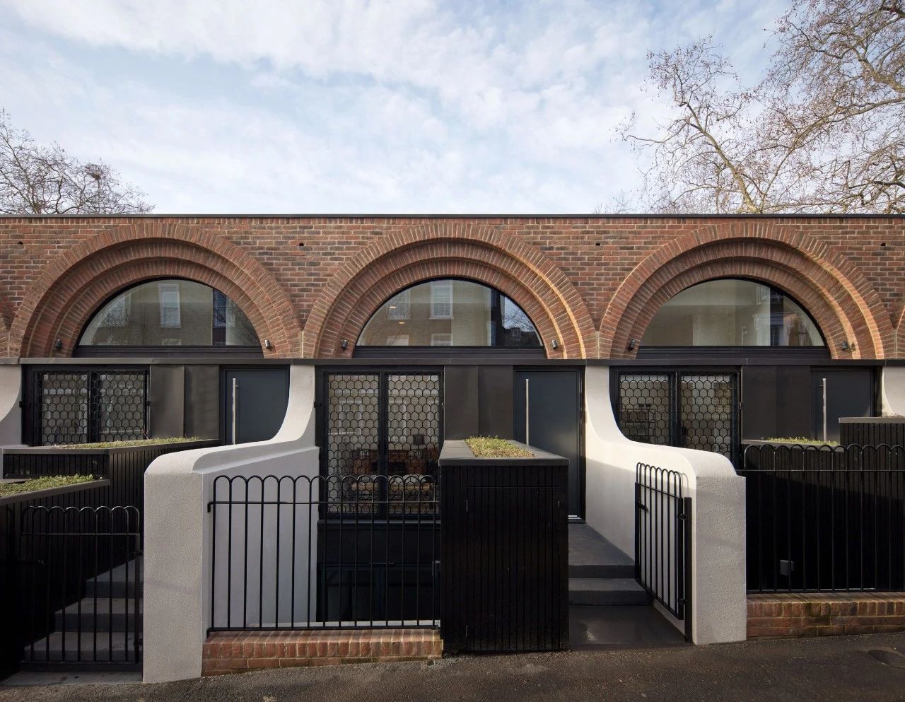 设计师大量运用经典的拱门红砖墙面设计了这个拥有6栋连排别墅的项目,每个住宅的入口都通向顶层,顶层包括书房和卧室。