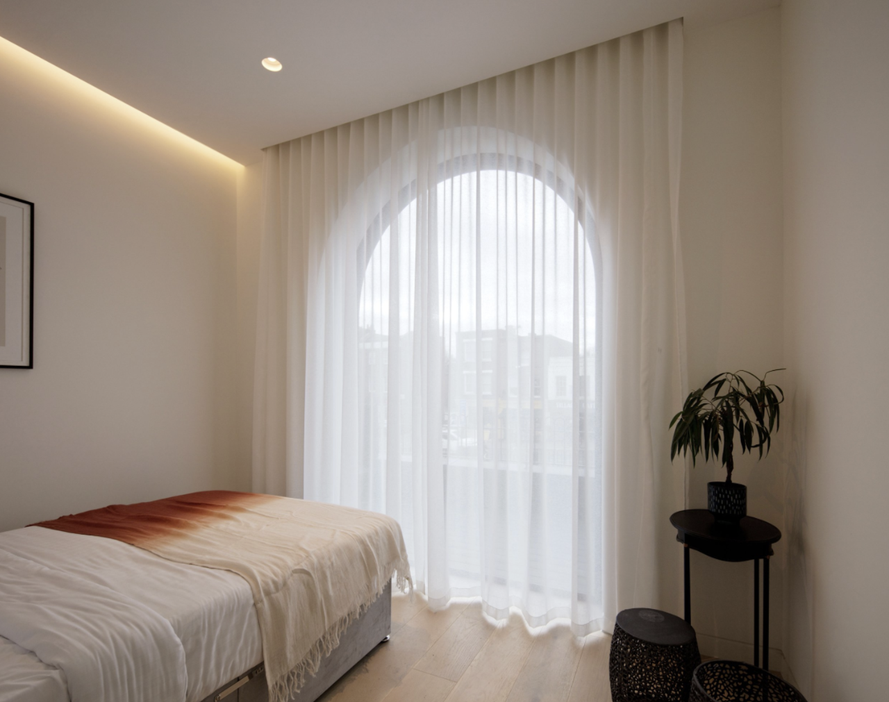 楼上的部分是光线充足的卧室,温柔高级的白色系,打造一种优雅舒适的感觉。