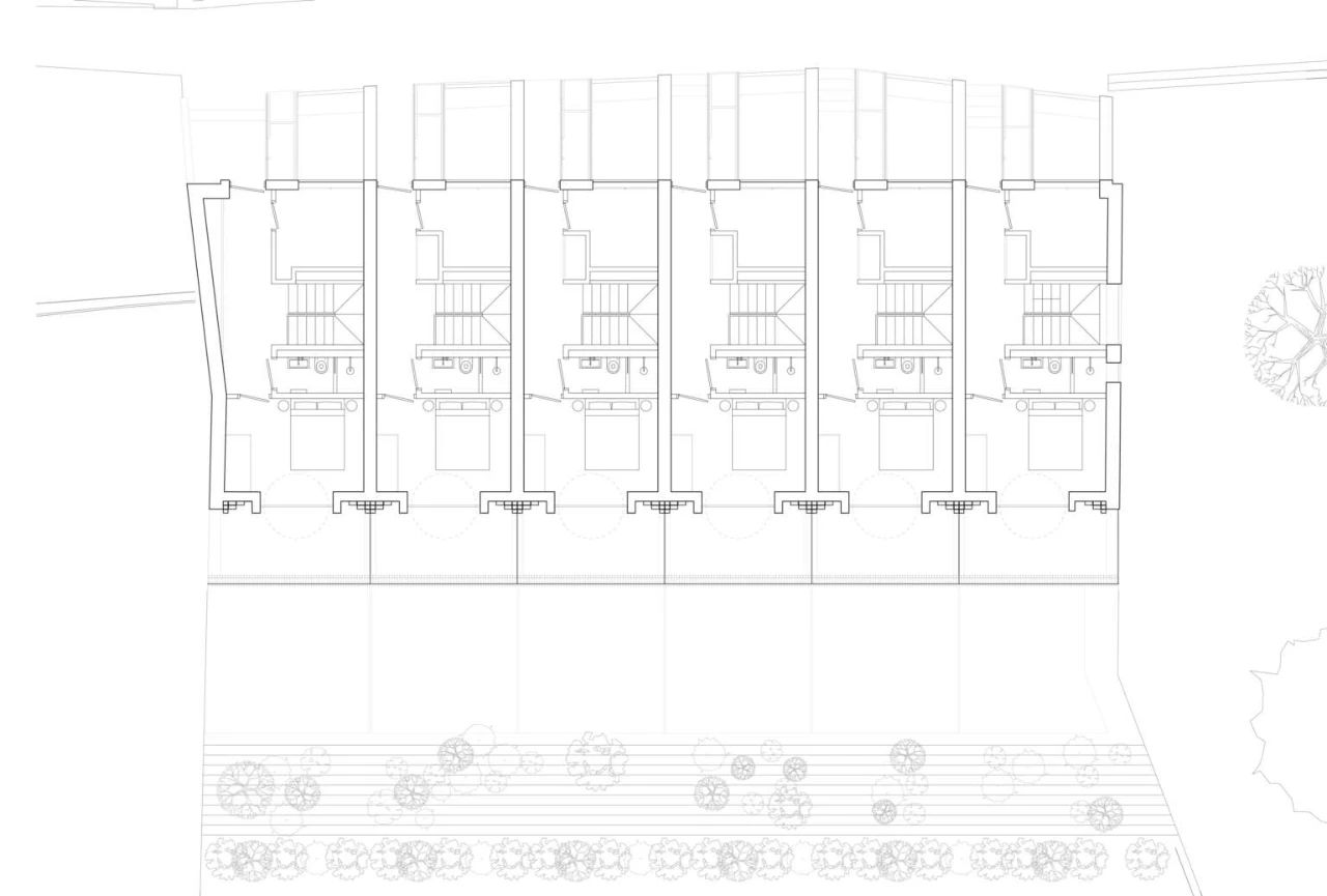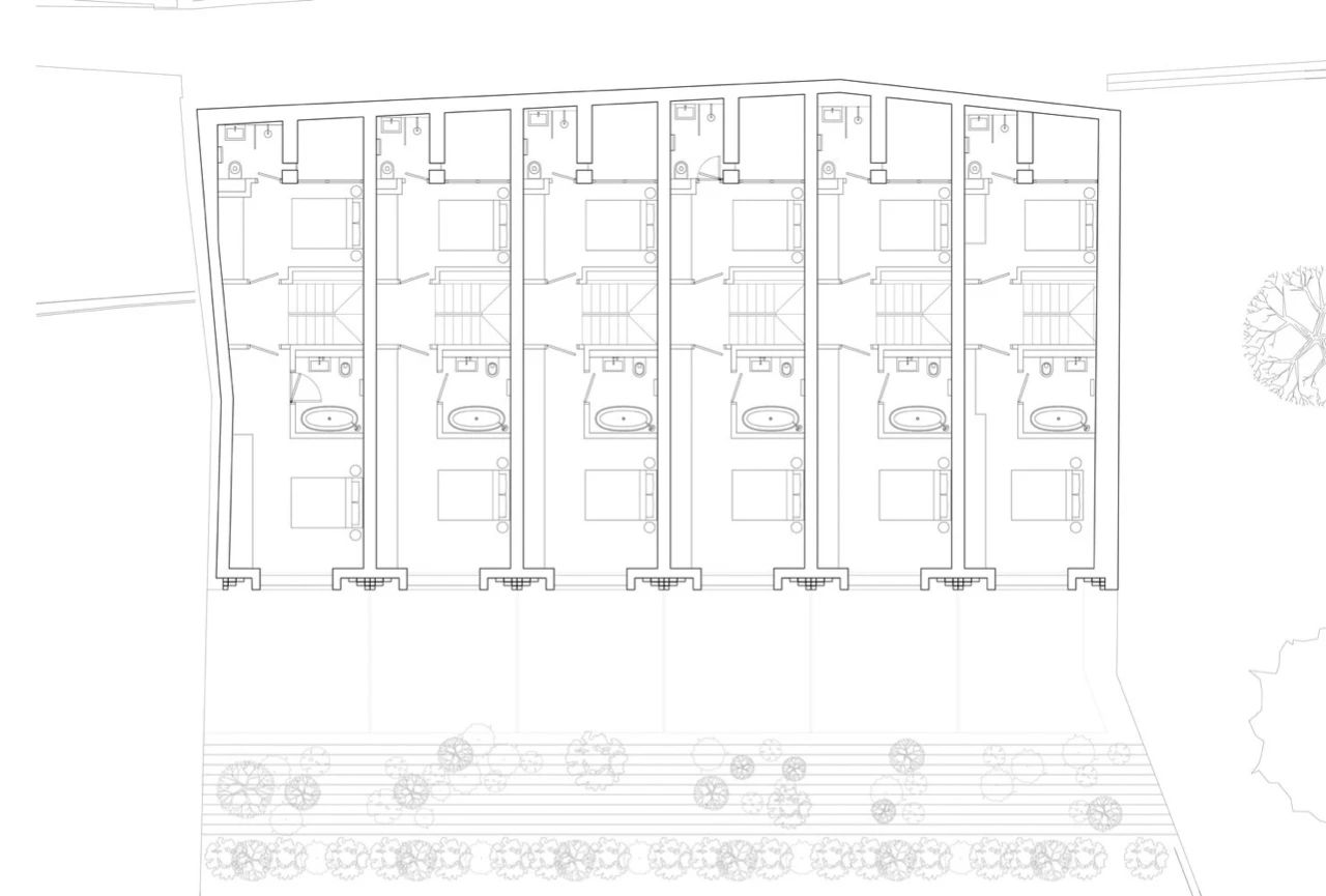 进门的这一面交错阶梯式的细节从邻近教堂建筑得到启发,每个住宅的入口都位于场地的后部,与沿街的旧农舍相一致。