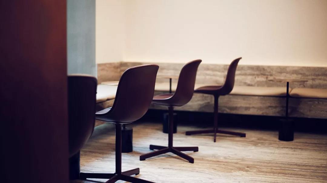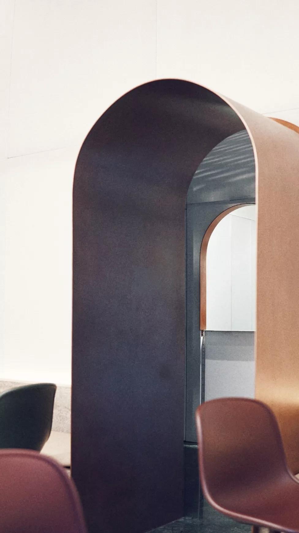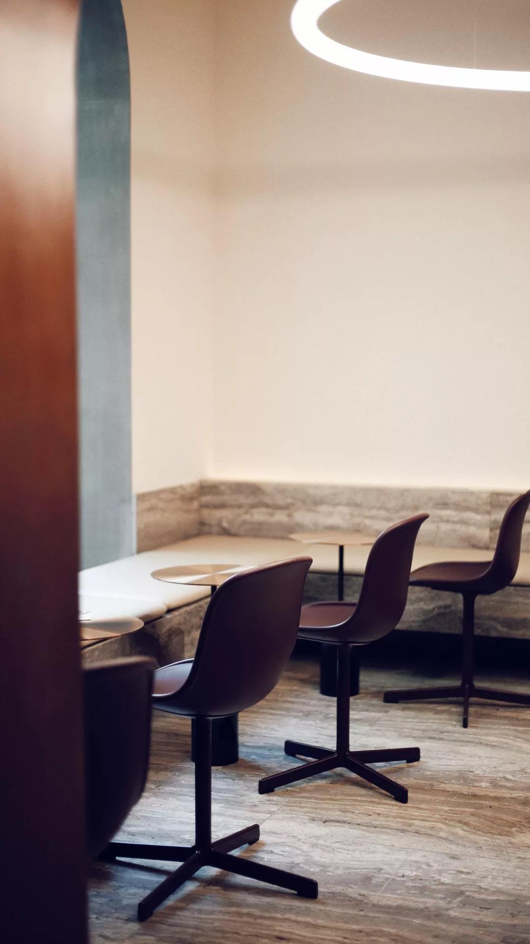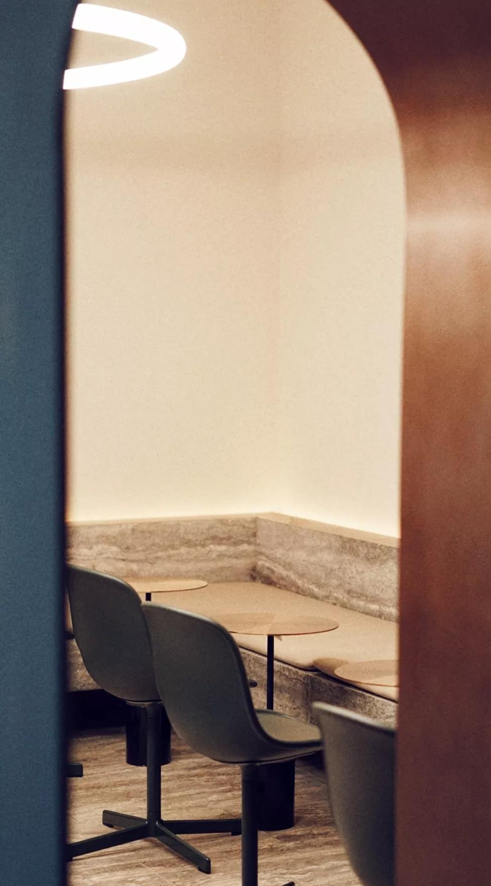 复合着酒吧与咖啡店的空间,由许多拱门排布构成,咖啡空间的吧台与座位由一条通往酒吧的走廊分割而开。暗红、墨绿色的椅子(HAY)与黄铜、大理石材质一起构成的咖啡空间,巨大的沿街玻璃窗,通透但独立静谧。