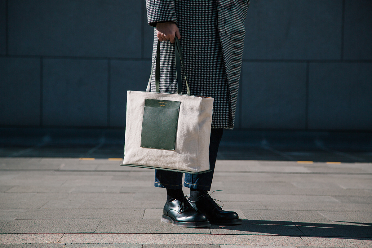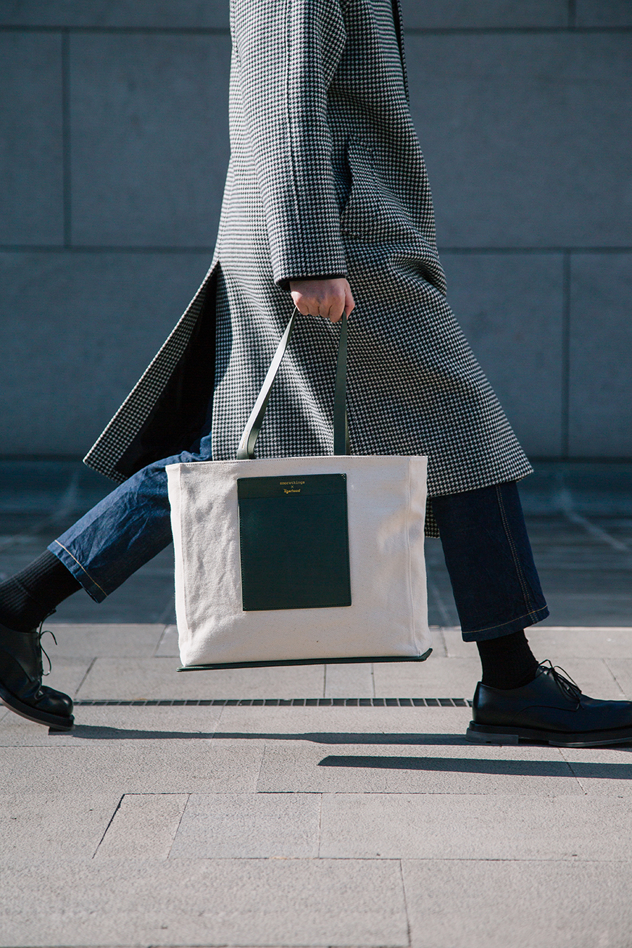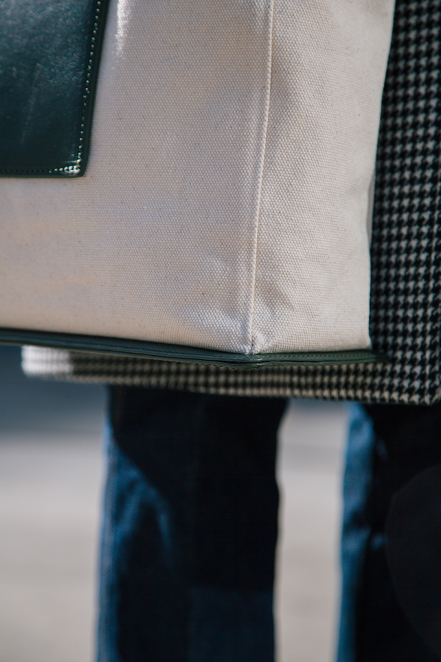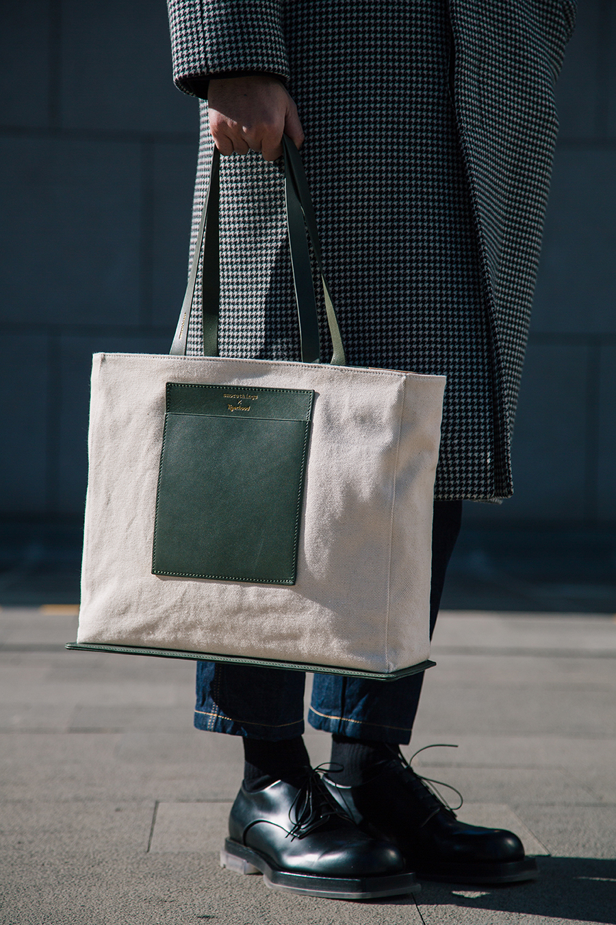 这款联名的托特包,使用品牌专门研发的绿色植糅头层皮与帆布进行搭配。帆布轻量随性的状态化解了植糅皮材料的厚重感,有更好的穿搭适应性。