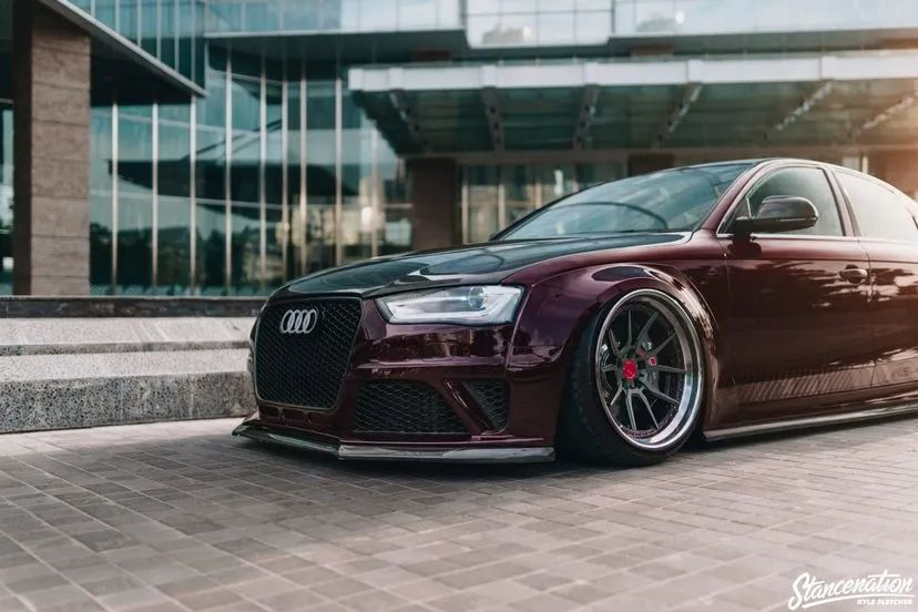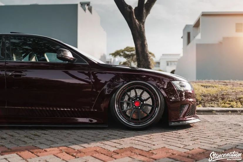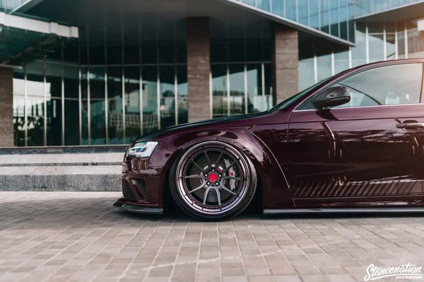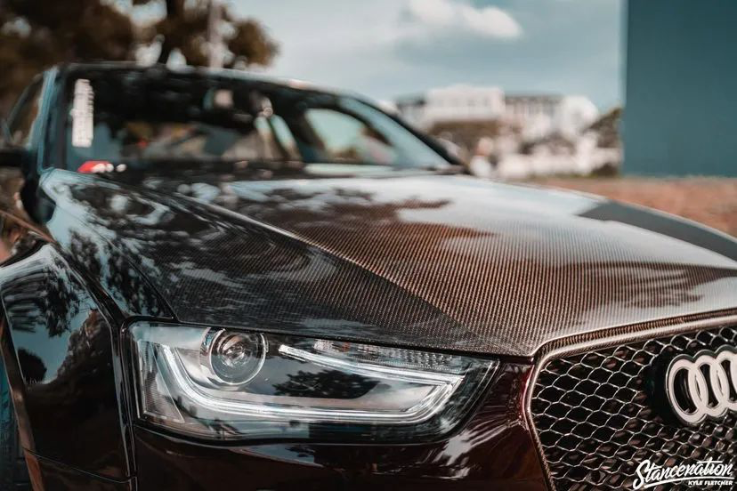 那咱们先从外观看起来。显然,车主给他这辆A4更换了RS4的前包围,而后包围则是选择了S4的双边四出款式,搭配定制的碳纤维下扰流,还有Seibon碳纤维前发动机盖和定制后尾箱盖,对于竞技风格的提升有很大的帮助,而车漆方面则也是定制的紫红色金属糖果漆,在不同光线下能够呈现出不一样的深浅。