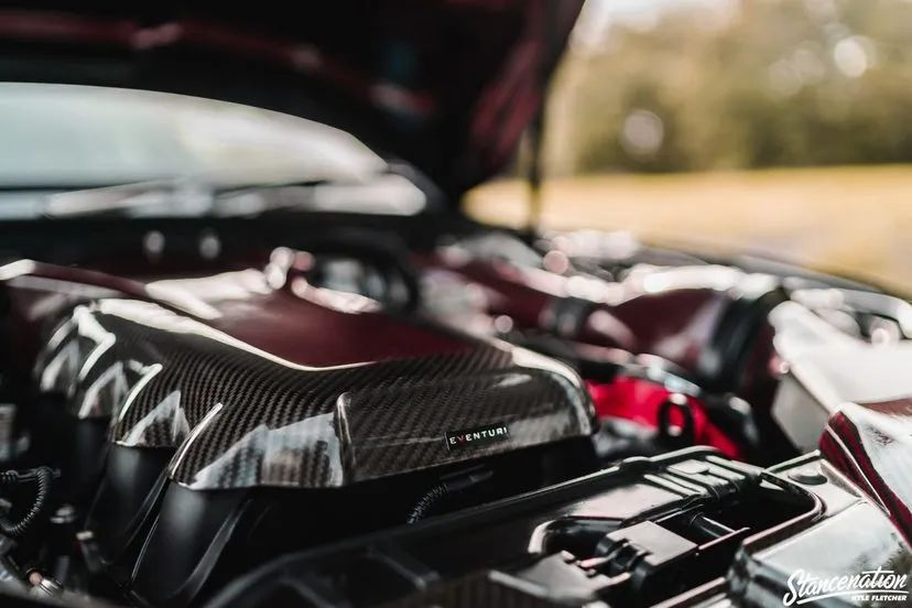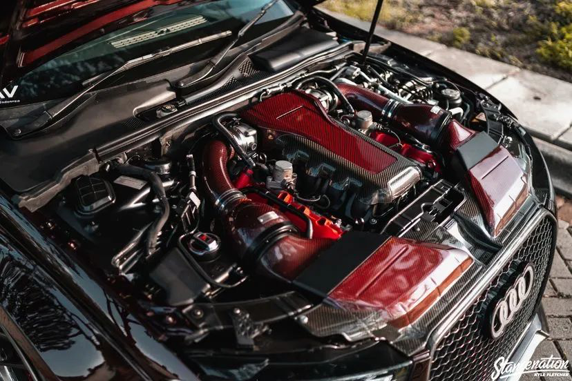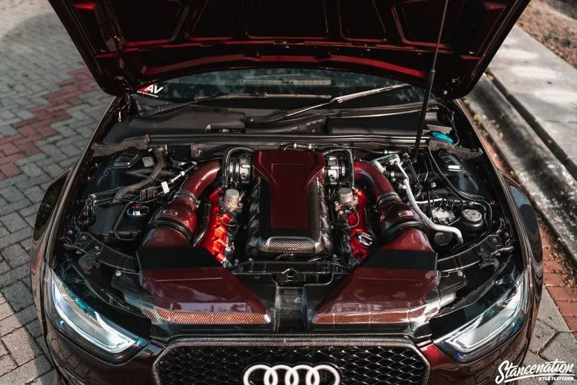 如果你觉得这辆A4改这套刹车是不是有点太装了,那接下来就告诉你它为什么会装。因为在它的发动机舱里,早已不是那副直列四缸的2.0T发动机了,车主选择了来自同门RS5的发动机,RS系列里面最后一副自然吸气V8发动机——4.2升V8自然吸气发动机,车主把整套动力总成移植过来,同时还做了一些升级优化,这当中就包括有Kline Performance的全段排气、Eventuri的碳纤维进气风箱。