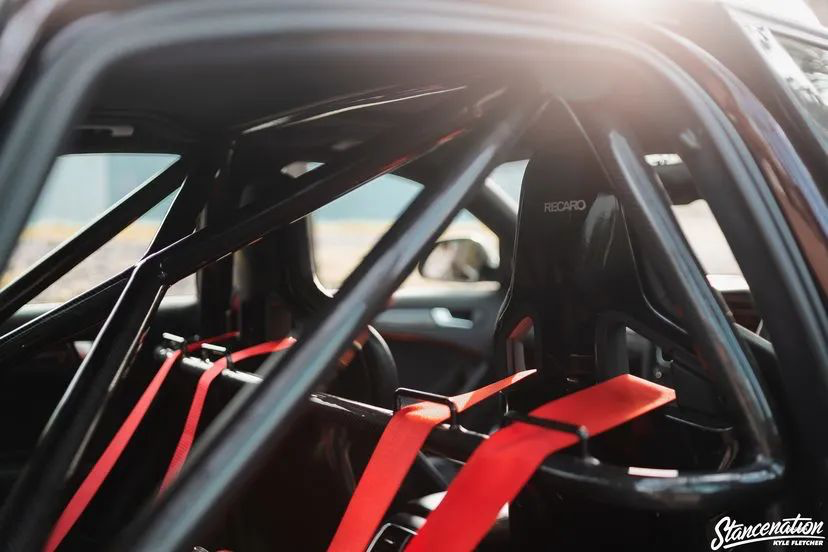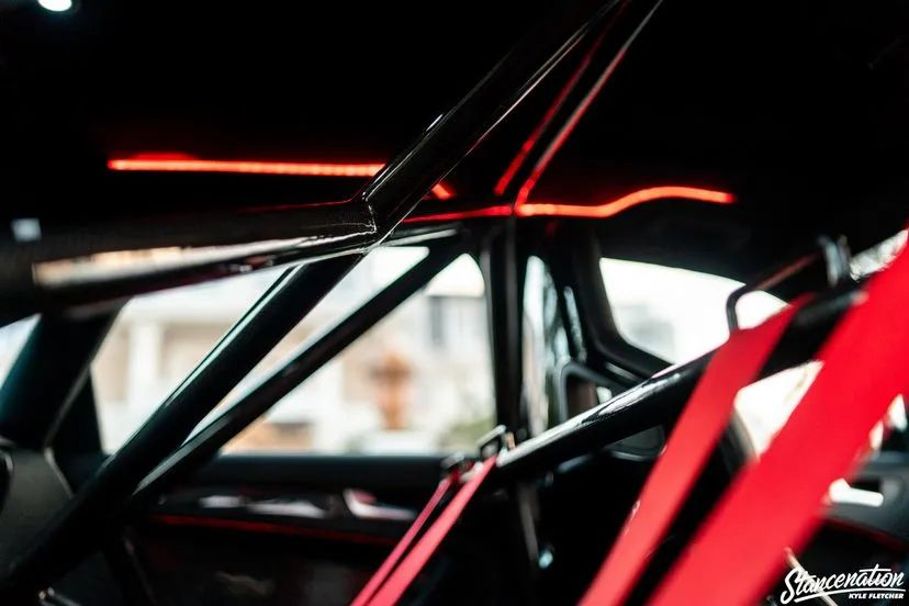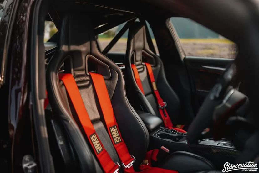 光是这样还不够,接下来将视角慢慢向后移。首先映入眼帘的便是这一对很多人都想拥有的Recaro Sportster CS赛车桶椅,搭配大红色的OMP四点式赛车安全带,而后排则被拆空装上了定制的四点式防滚架。