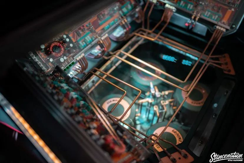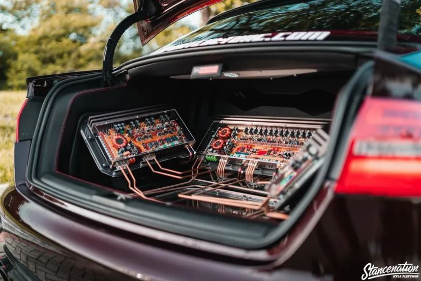 这辆奥迪A4最后的一个亮点位于它的后备箱里面。车主安装了3套功放在这里,并且都用透明外壳展示,通过铜线硬链接和Helix DSP链接,同时备胎位置还打造了四个低音喇叭的专属位置。