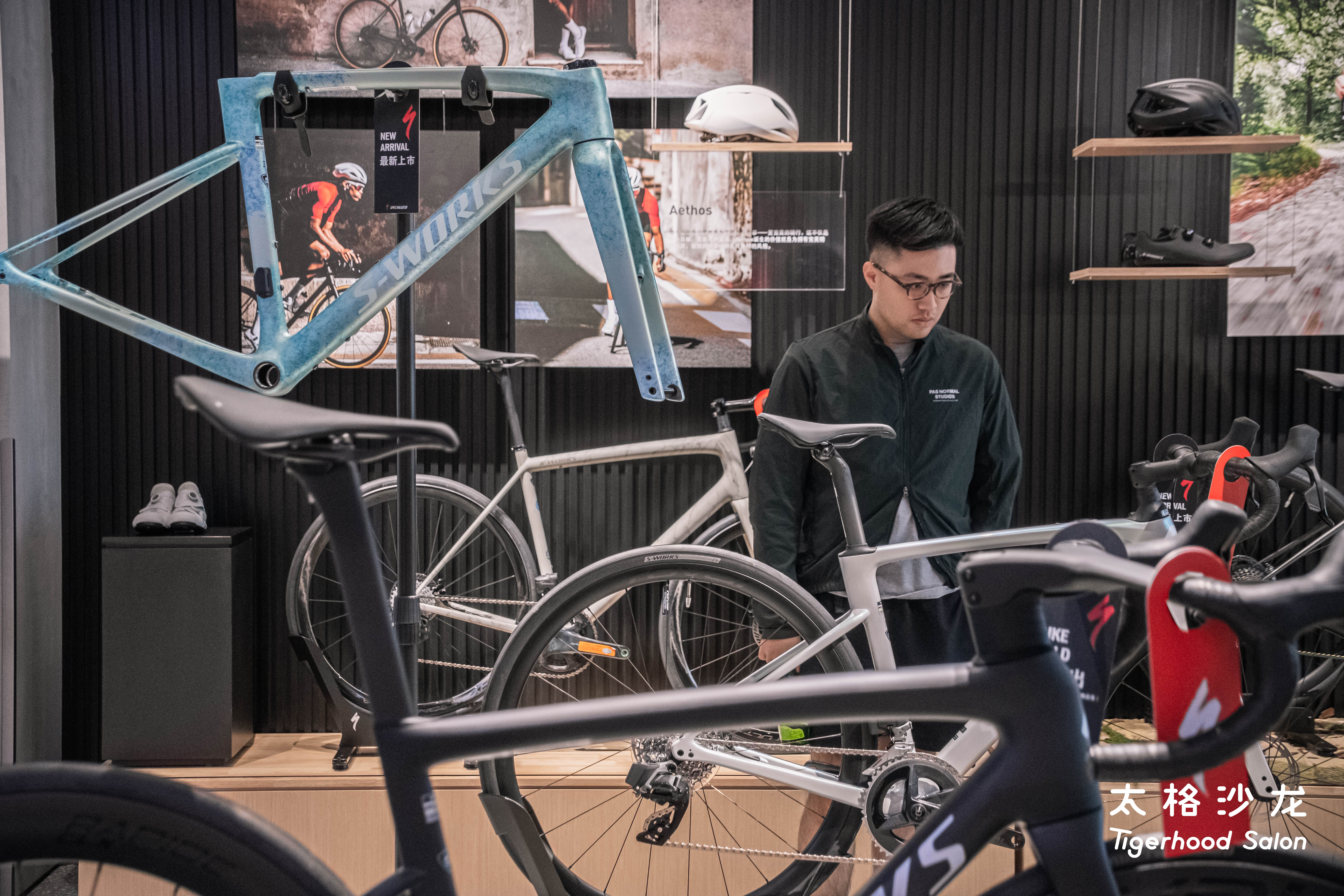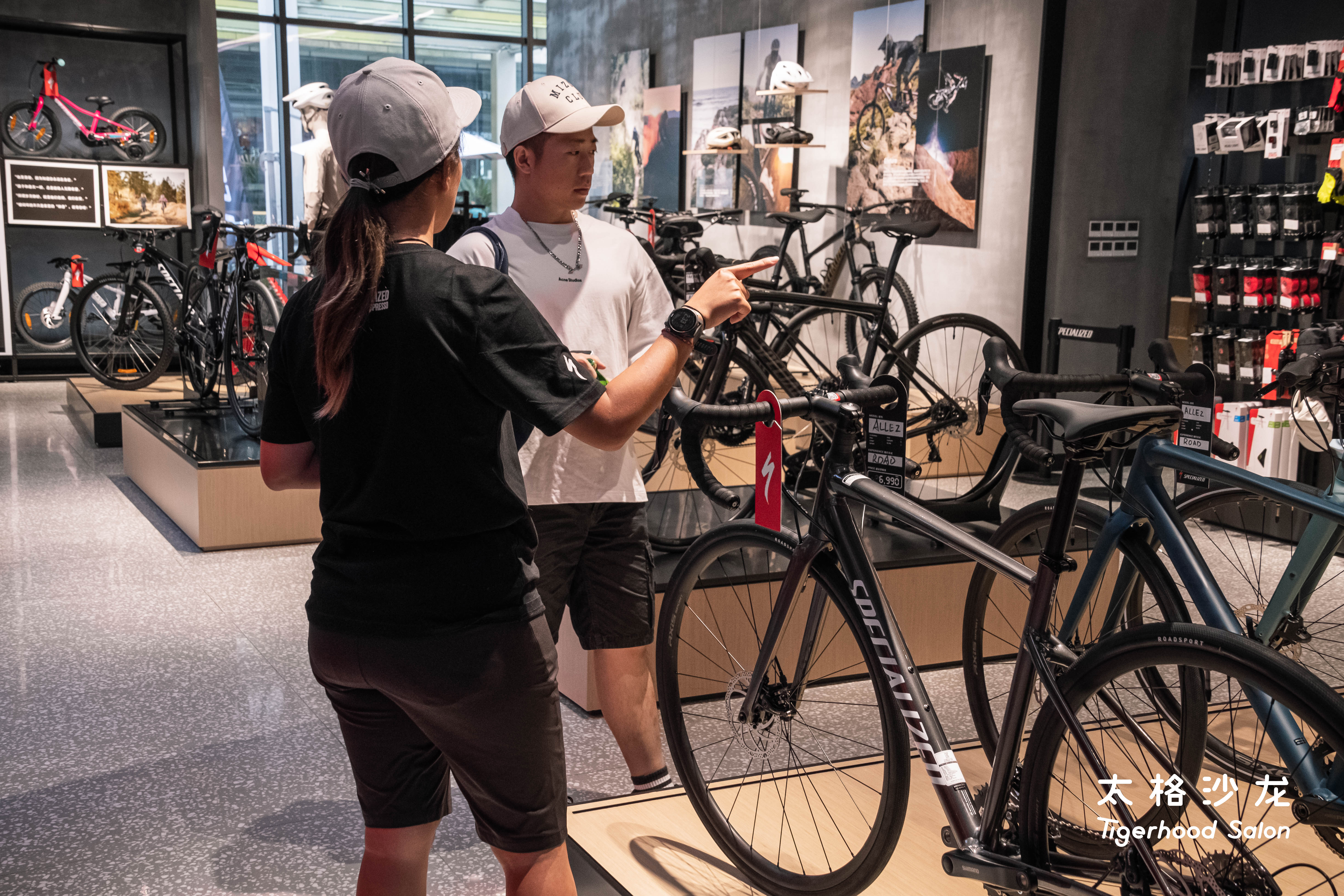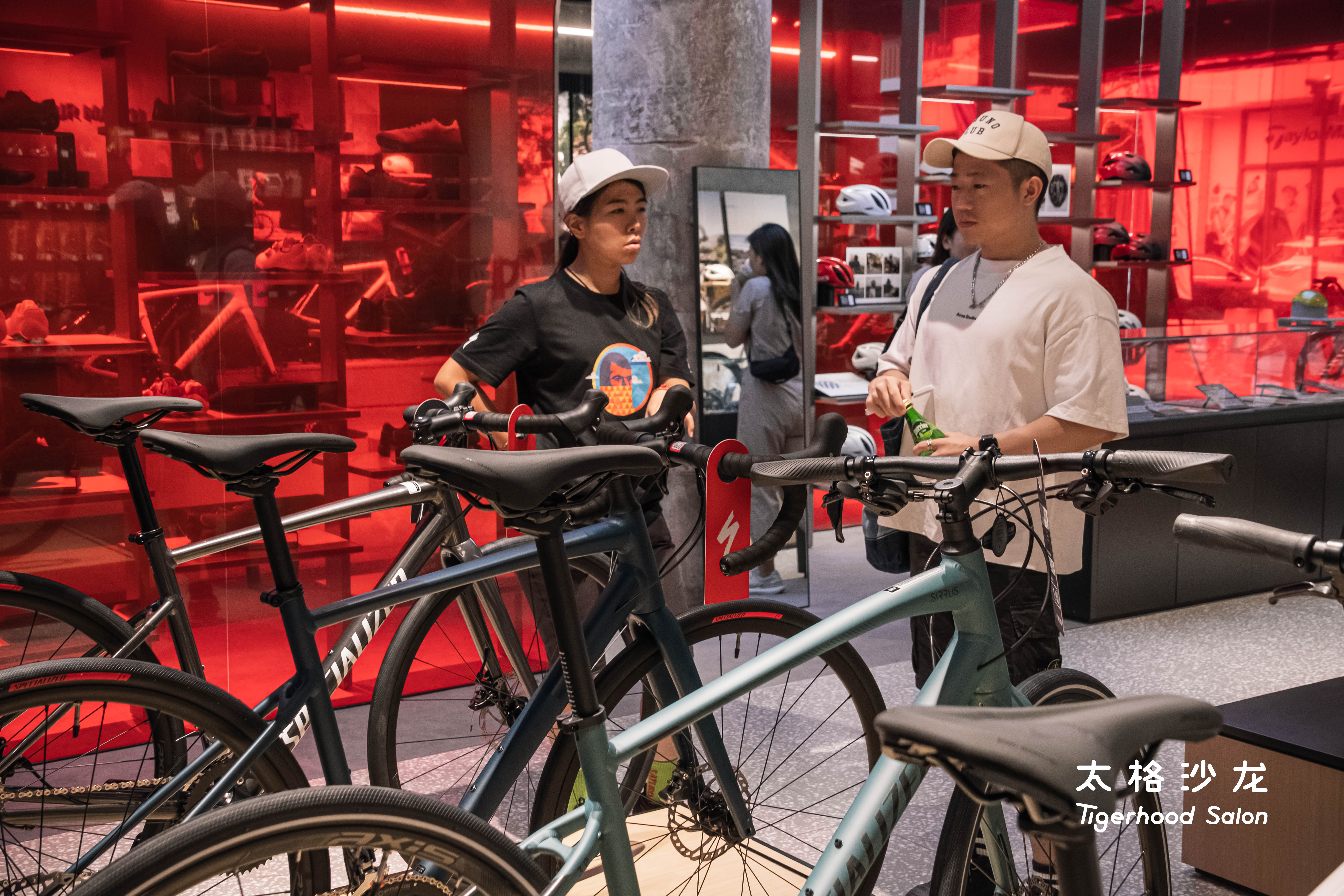而活动当天天气也非常适宜公路骑行,厚重的云层遮挡了部分阳光,裹挟着微风,安静又舒适。随着大家陆续到达 Specialized 店铺签到入场,骑行课堂还未开始就有不少朋友已经与 Specialized 店员交流起店内摆放的公路车,店员也热心指导到场的朋友如何测量自己的数据,选择合适自己体型的车型。