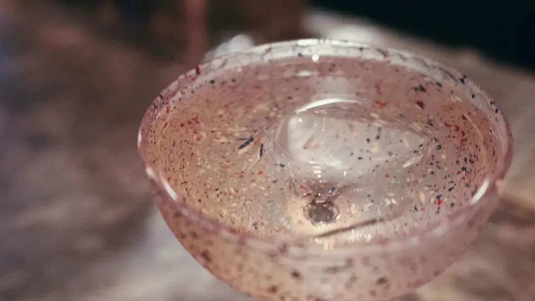 同样采用了奶洗澄清技法,目的是为了获得澄清的酒体来凸显杯子内壁深邃的黑色和冰块在杯口的反光。