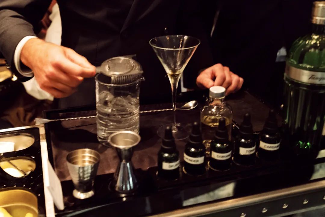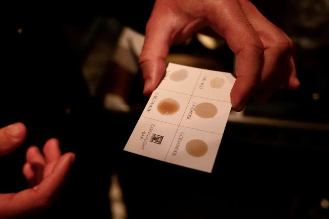这其中也包括他们自家蒸馏的Connaught Gin,但既然是第一次来,还是选择了经典的添加利10,随后Bargiani将他们自制的五种苦精分别滴在一张闻香卡上让我依次闻香选择。