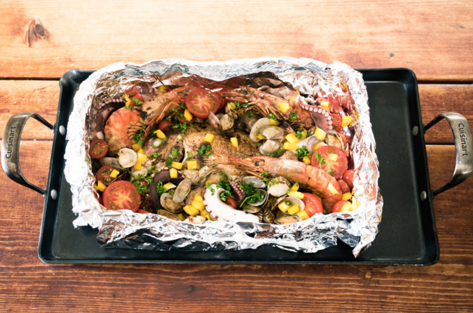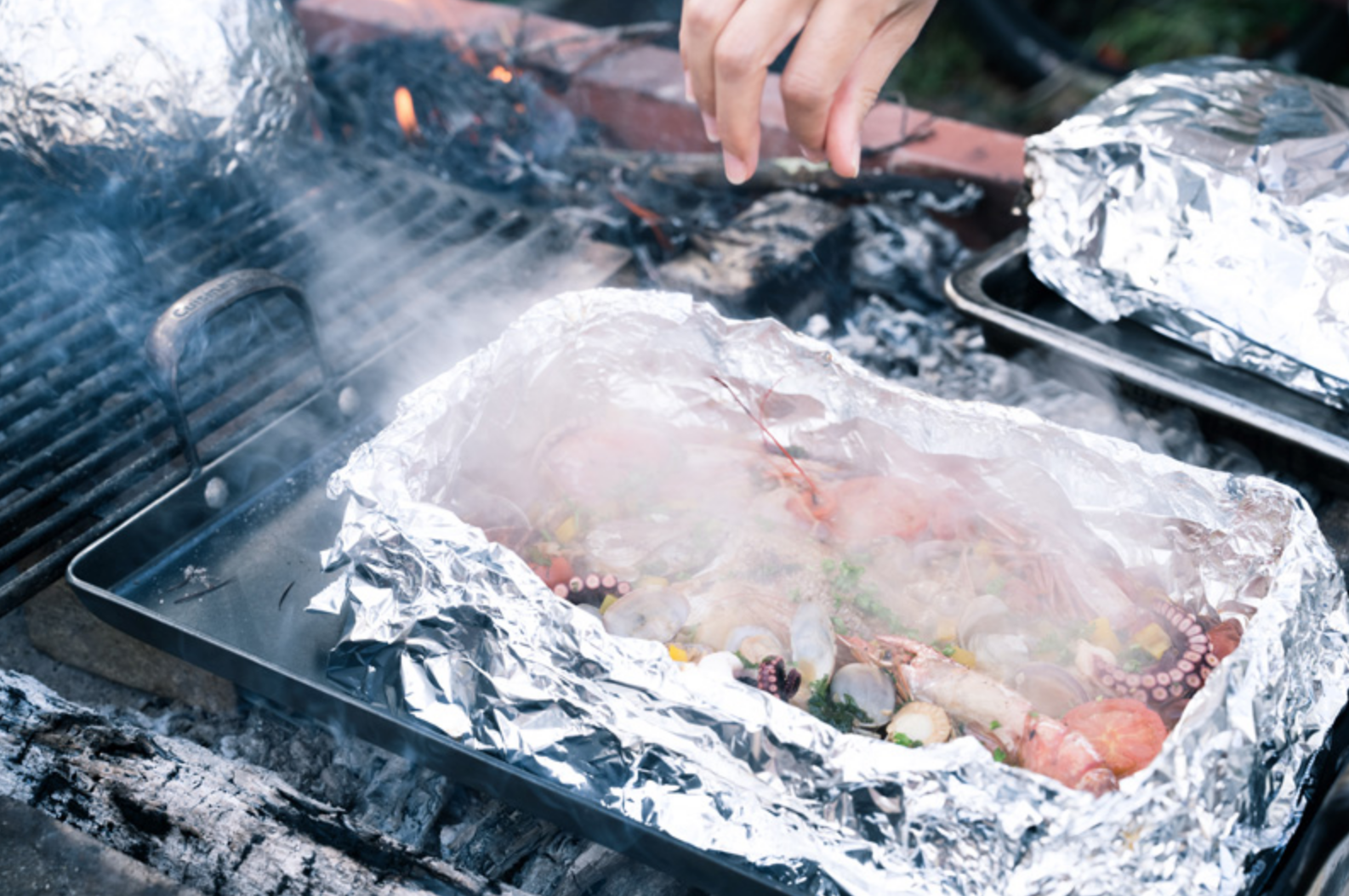 锡纸是一种非常实用的烹饪材料,因为它几乎可以料理万物。在露营之前,可以提前在家中处理好食材。将鱼、扇贝、蛤蜊、章鱼、虾、欧芹、橄榄油、辣椒粉、迷迭香、盐、胡椒、大蒜、黄油、白葡萄酒等进行混合。然后将火烧好之后,放入锡纸之中进行烤炙即可,一款非常美味的锡纸海鲜就做好了。